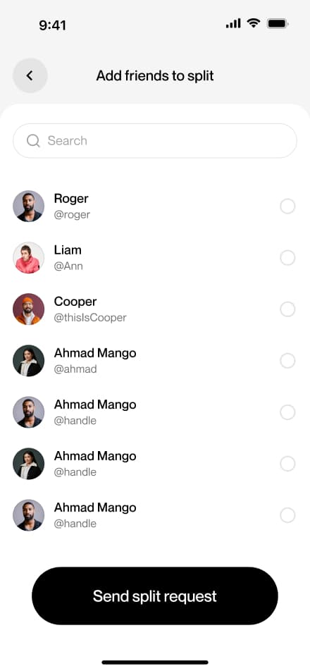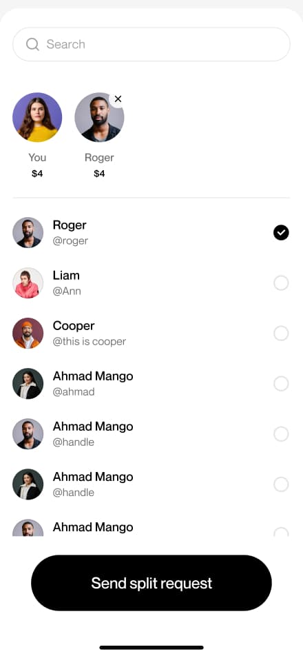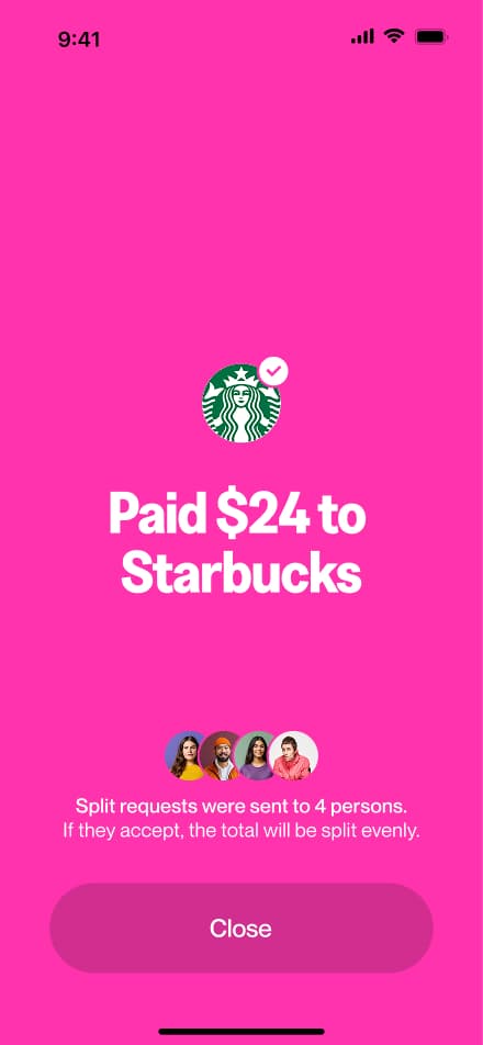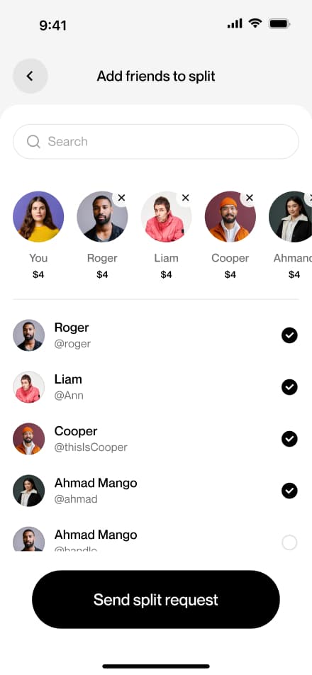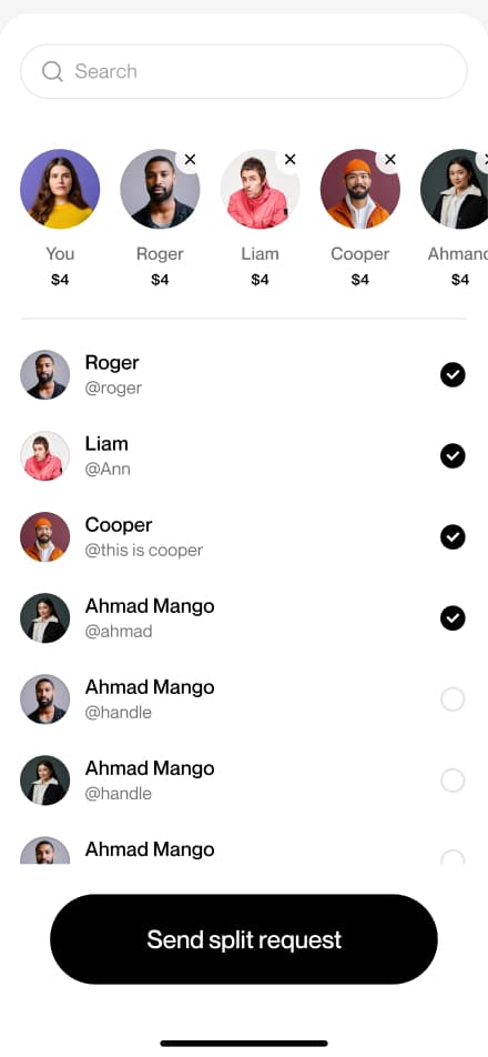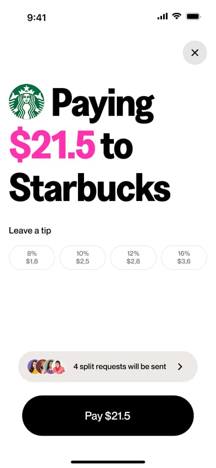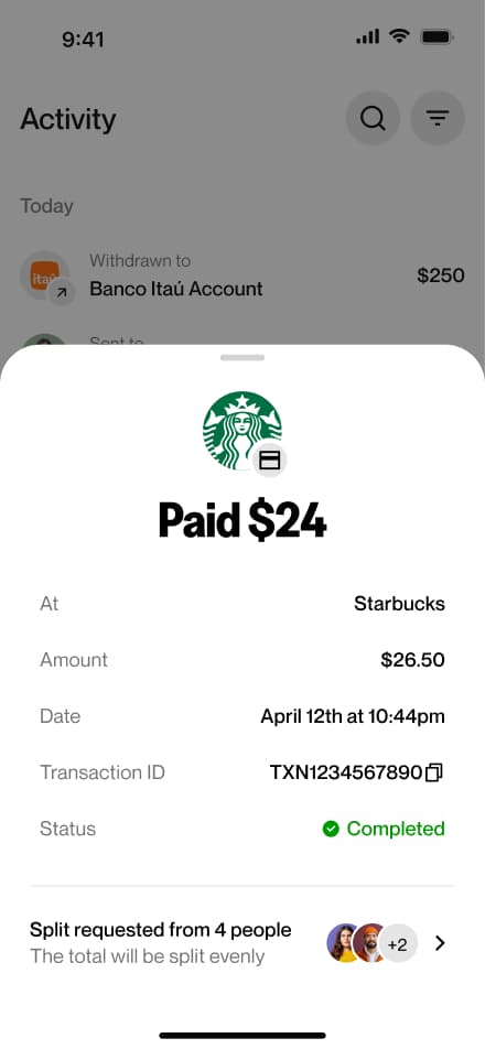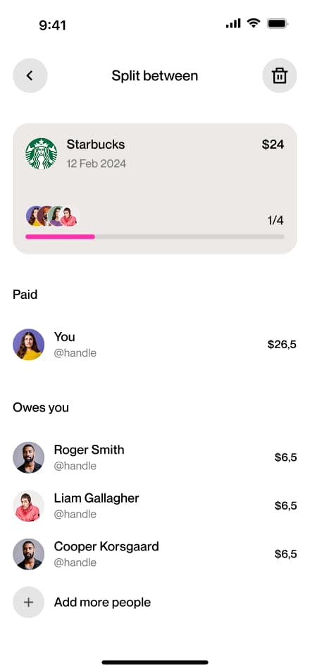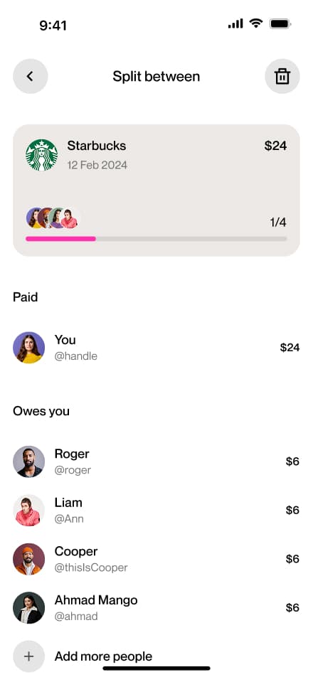 6 screensUsers can split a payment among multiple people from the activity screen opening the relevant payment and initiating a split directly from there.