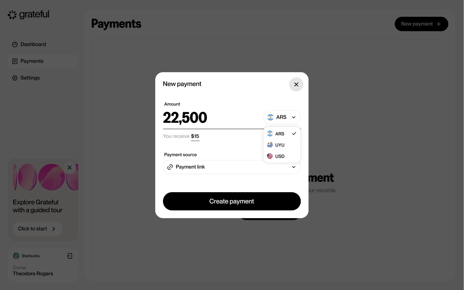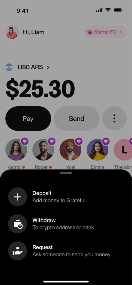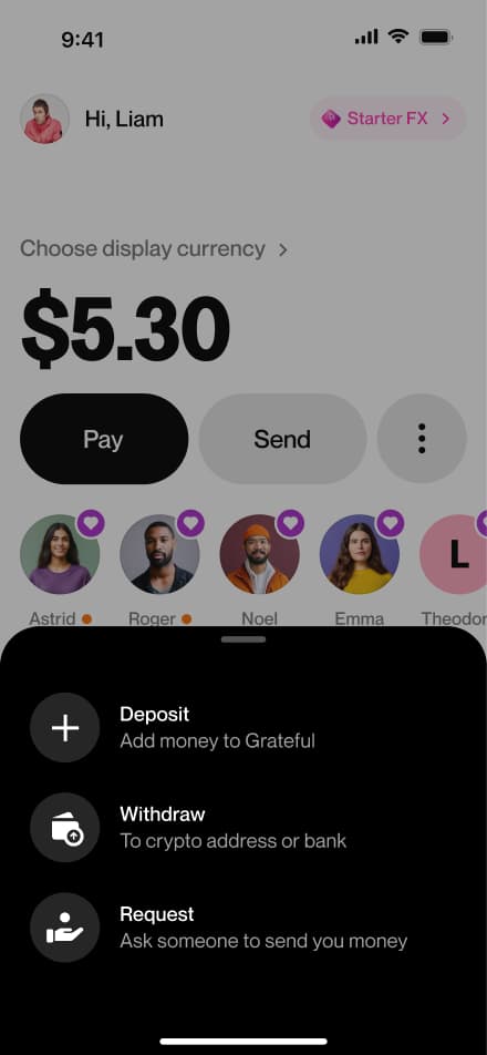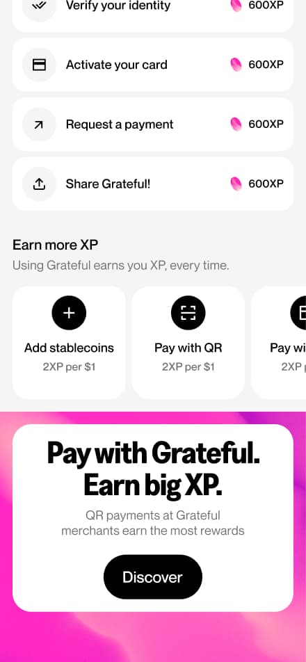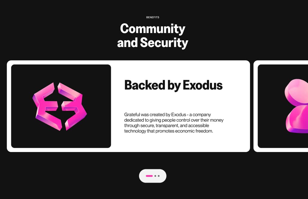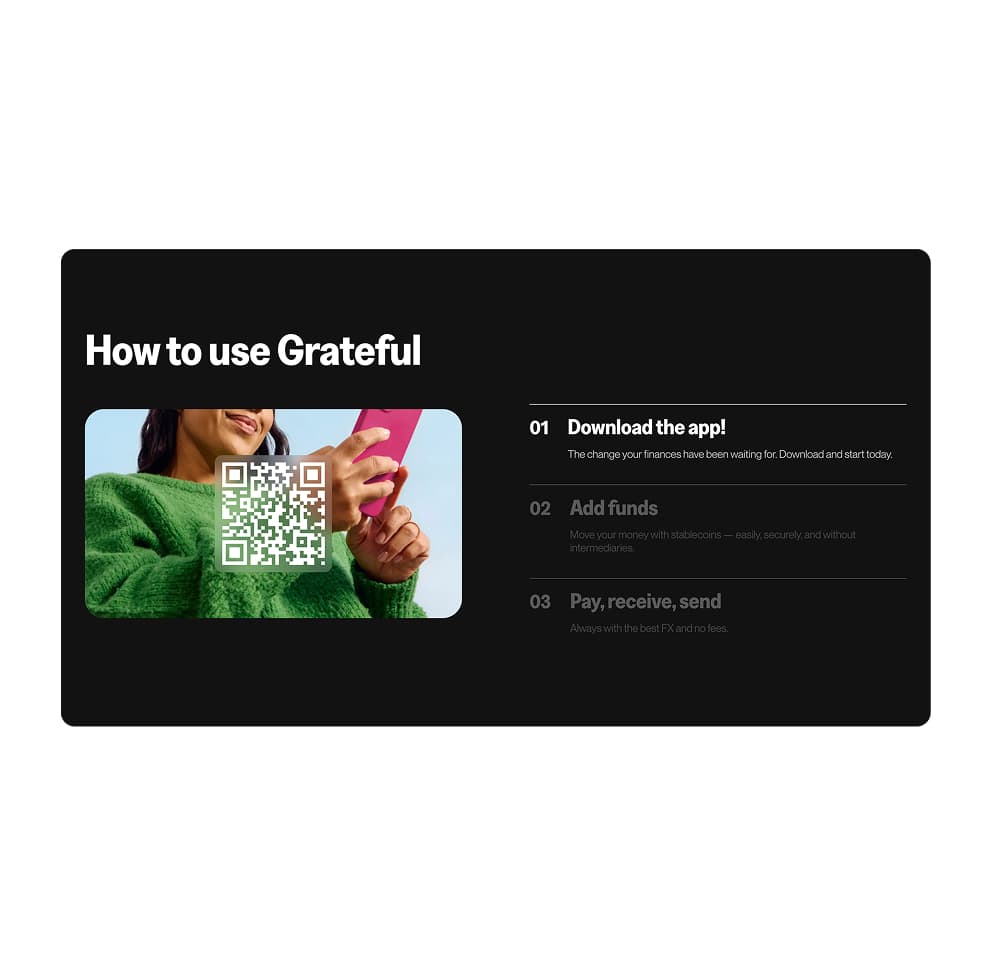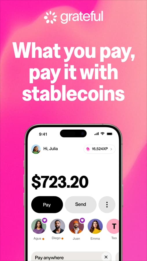 That's why we built Grateful: the simplest, most direct way to pay with stablecoins. No detours. No hidden fees. No surprises. Pay anywhere, send money globally, or split a dinner in seconds. All backed by the experience and trust of Exodus, with over a decade bringing crypto closer to people.
