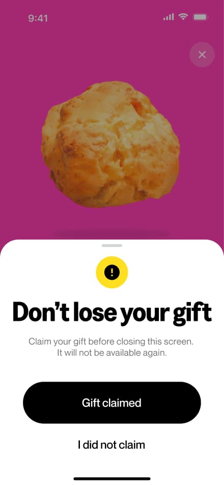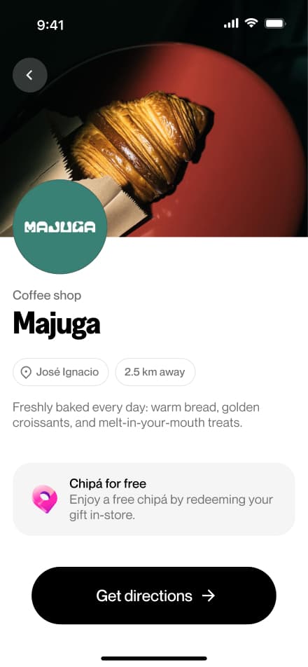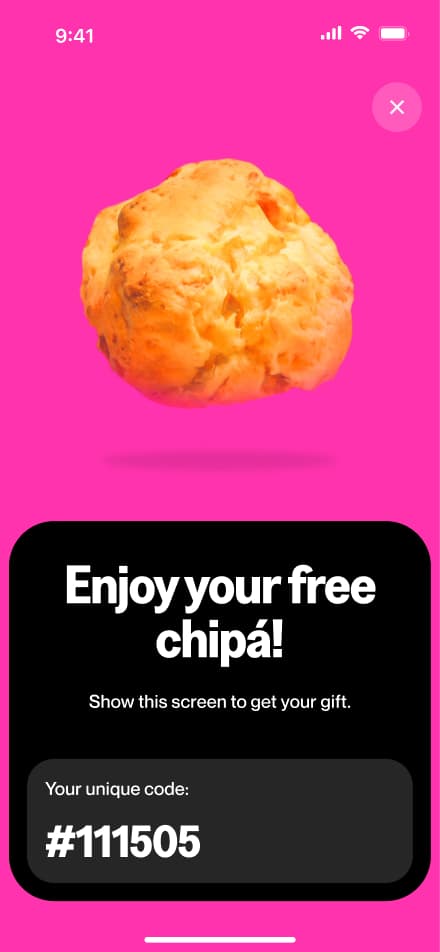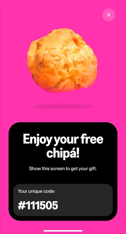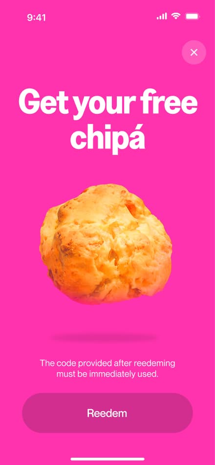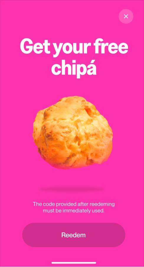 6 screensThe Claiming Chipá flow allows users to claim limited food promotions available at participating shops. Users scan the store's code, hit redeem, and the chipá is theirs to enjoy.