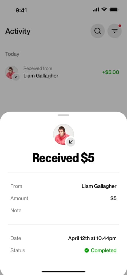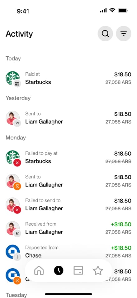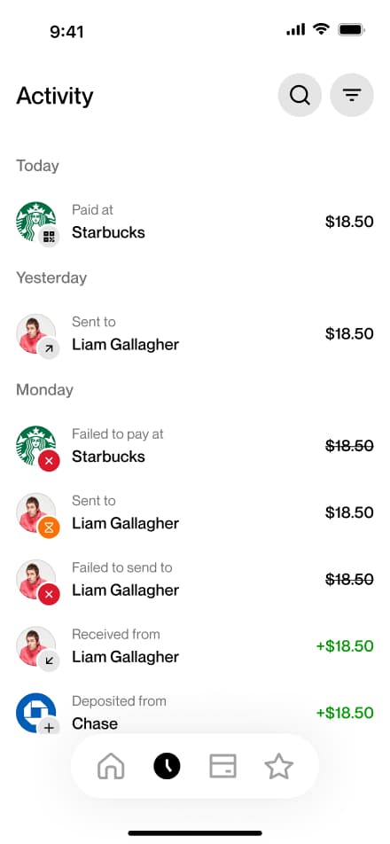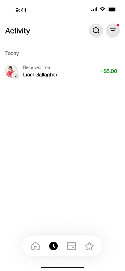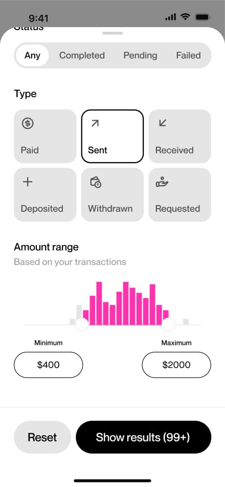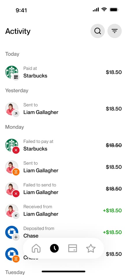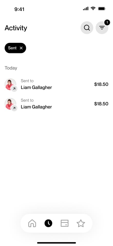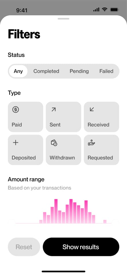 6 screensThe Filter Transactions flow allows users to narrow down their payment history directly from the Activity screen.