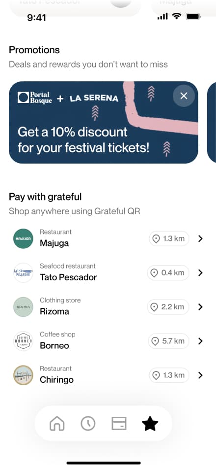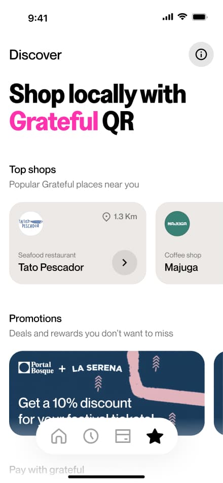 4 screensThe Finding a Grateful Shop flow allows users to discover local businesses that accept Grateful payments. Users navigate to the Discover section, where they can browse and find nearby shops ready to accept payments through the app.