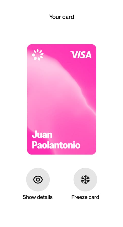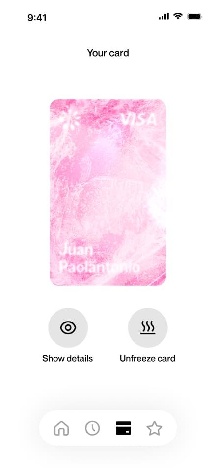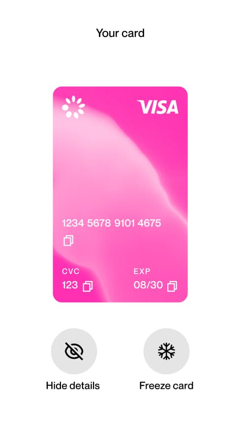 The card appears across different states within the app: from the initial request screen, where users are prompted to get their card, to the active state with full details visible, frozen, or hidden. Each state is clearly communicated through the card's appearance and the actions available below it.