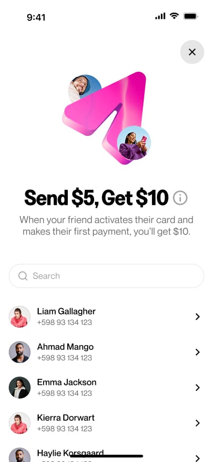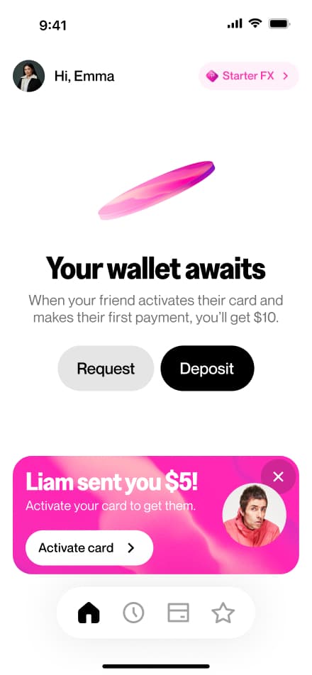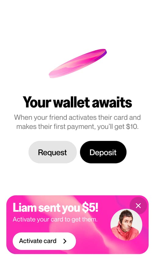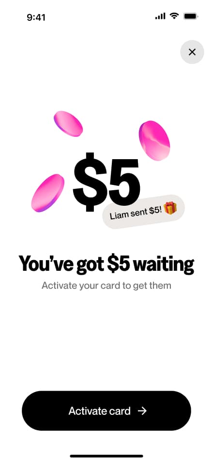 7 screensThe Get $5 flow is the invite recipient's side of the referral experience. Upon completing onboarding, users are notified that $5 is waiting for them as a welcome reward, and that they must activate their virtual card to claim it.
