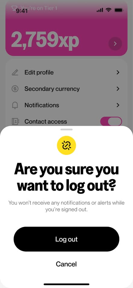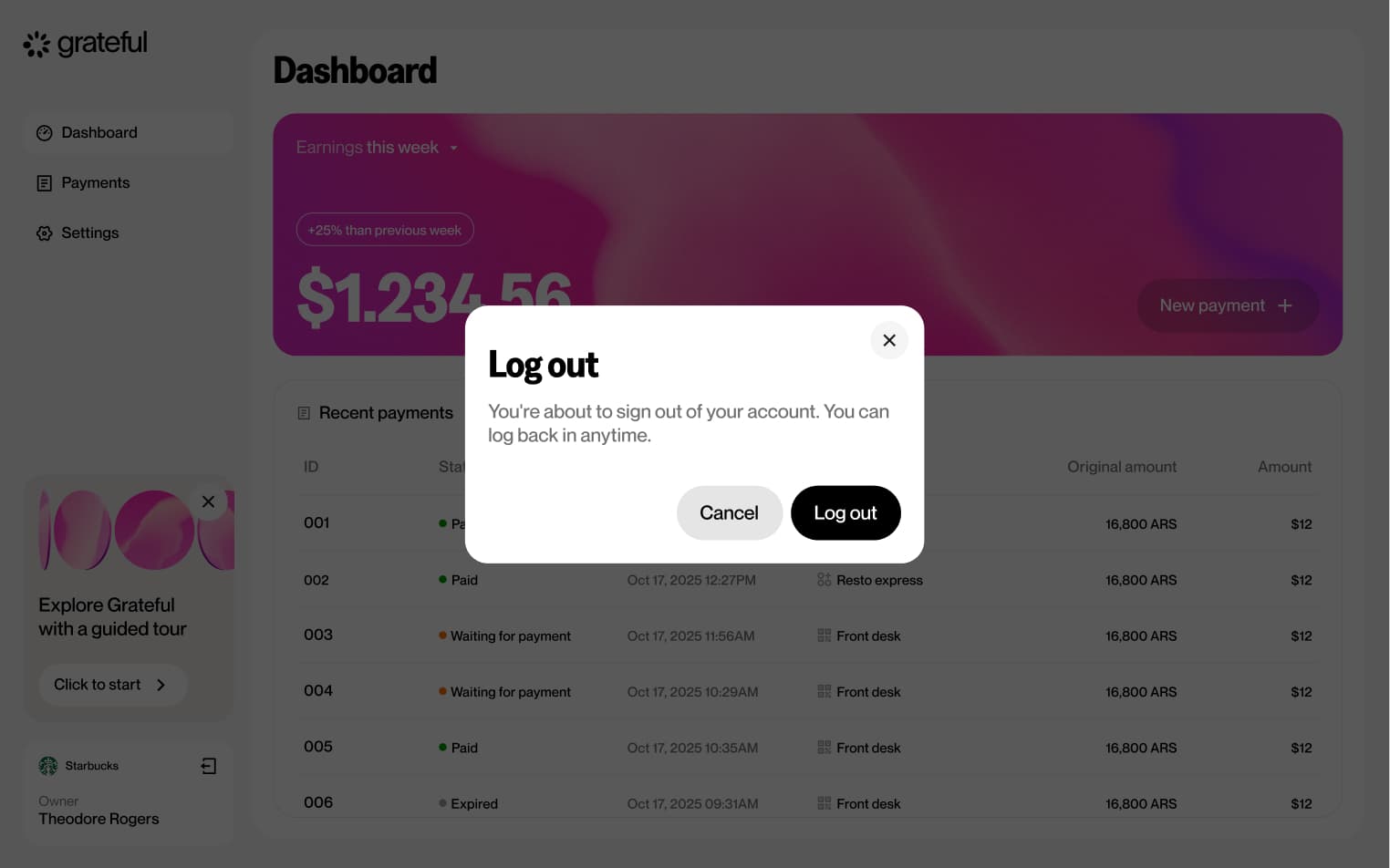 2 screensThe Logout flow allows merchants to sign out of their account directly from the main dashboard.