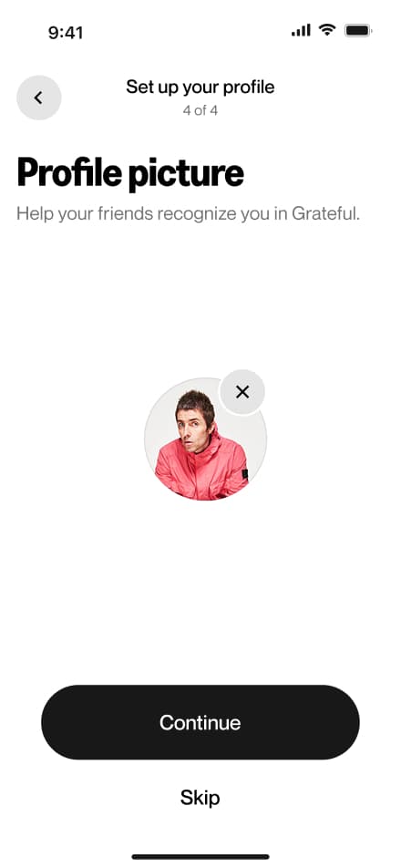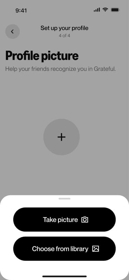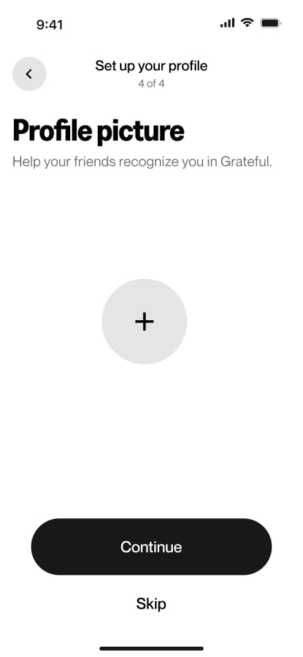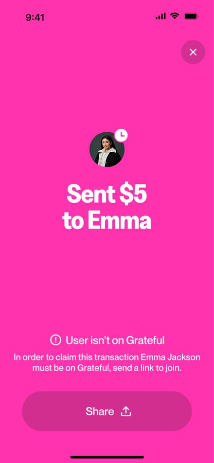 5 screensThe Send an Invite flow encourages users to grow the Grateful community by inviting others directly from the home screen. In return, users receive a reward for each successful invite.