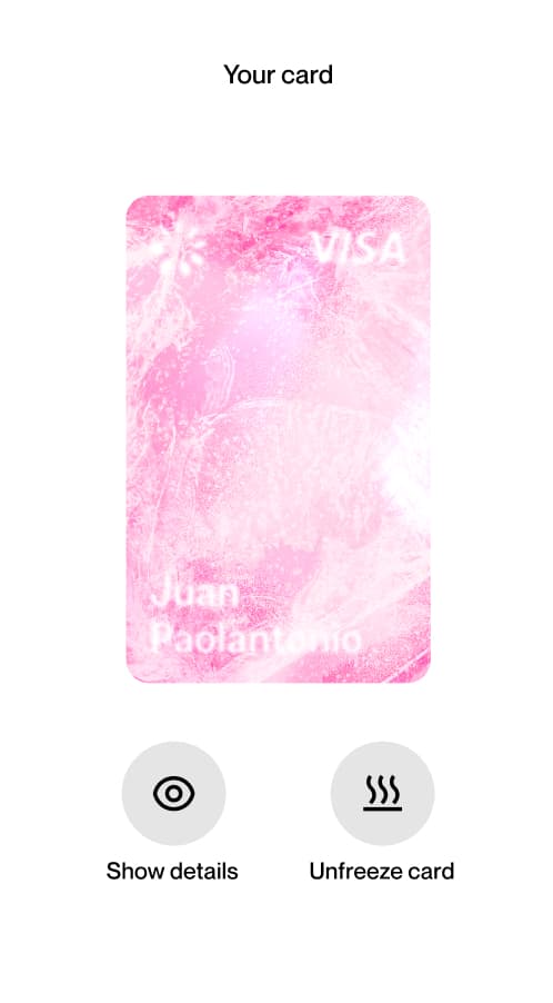 3 screensThe Freezing Card flow allows users to temporarily freeze their virtual card. Users navigate to the Card section, select Freeze Card, and the card is immediately suspended.