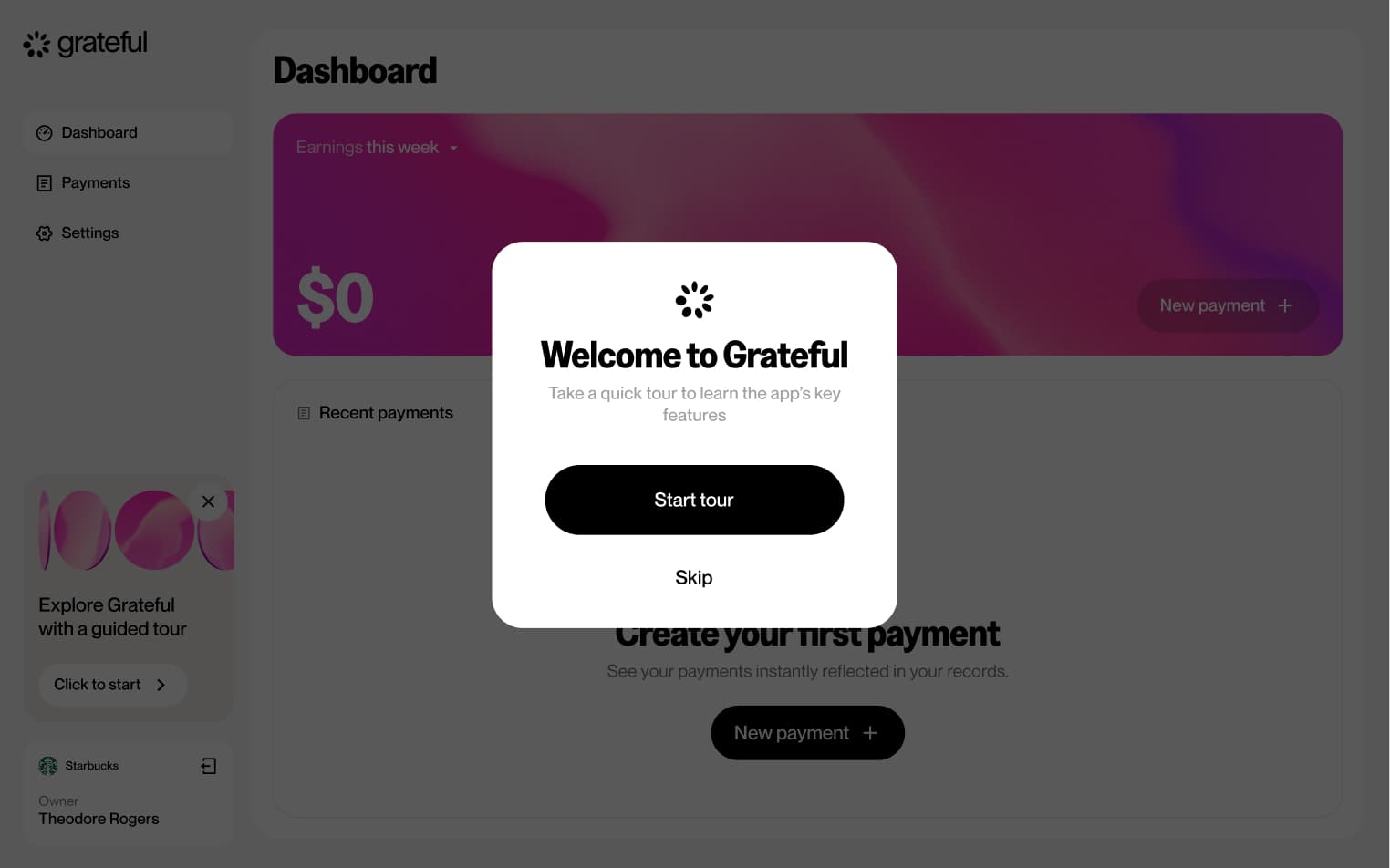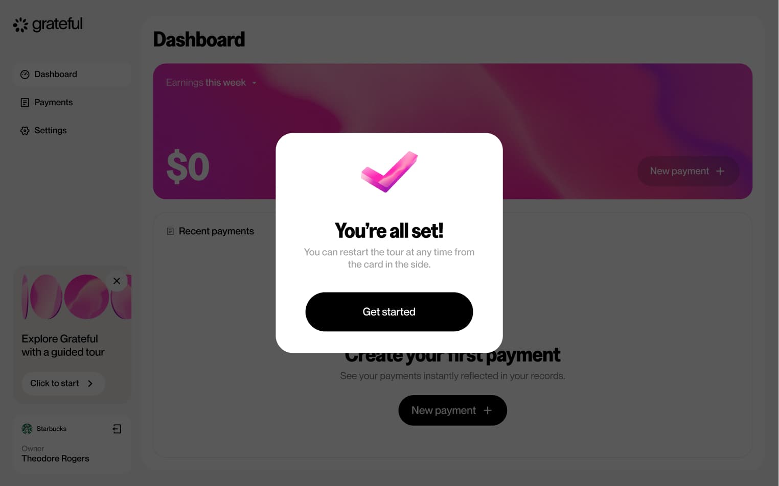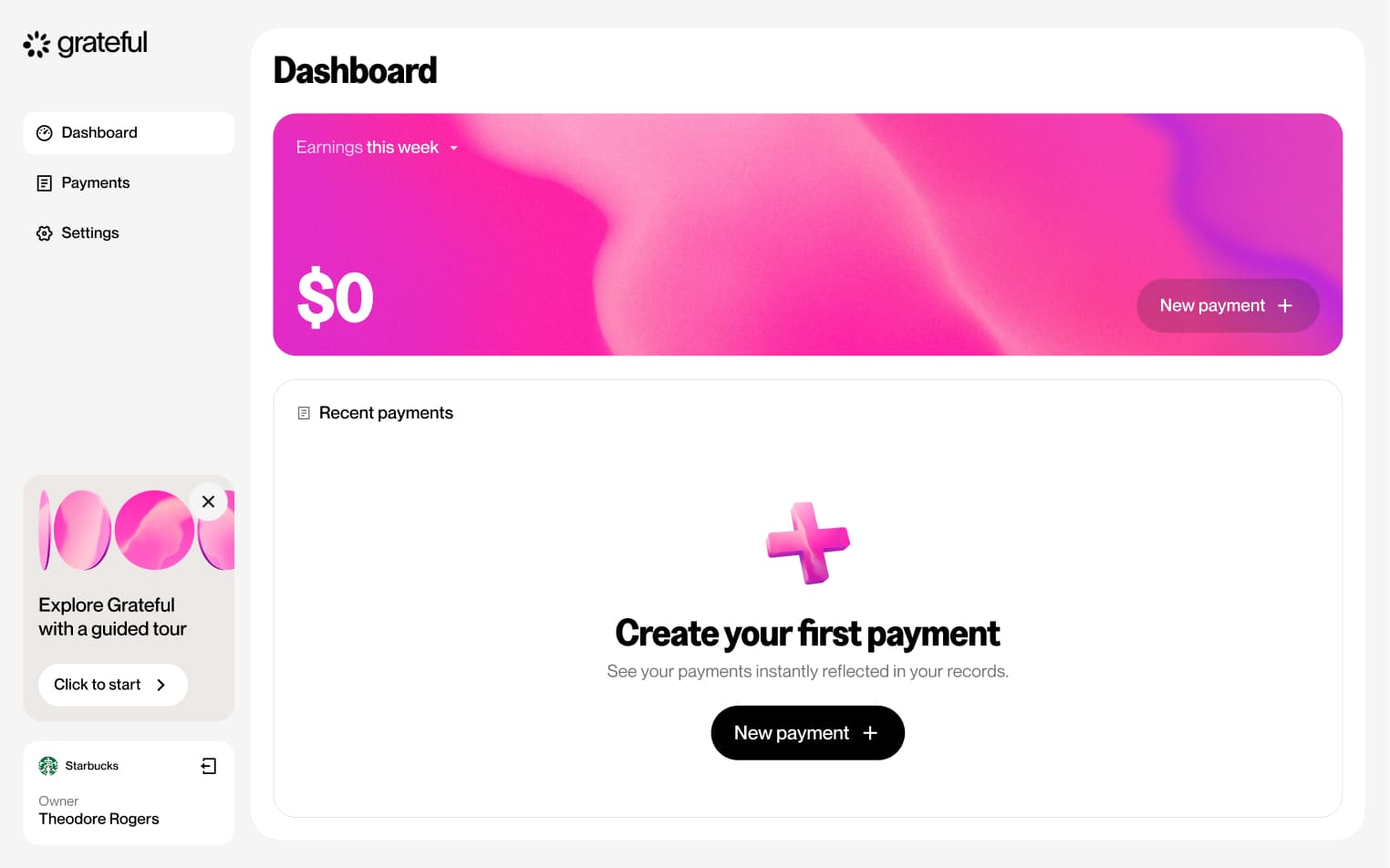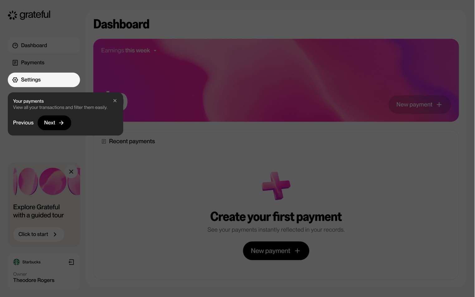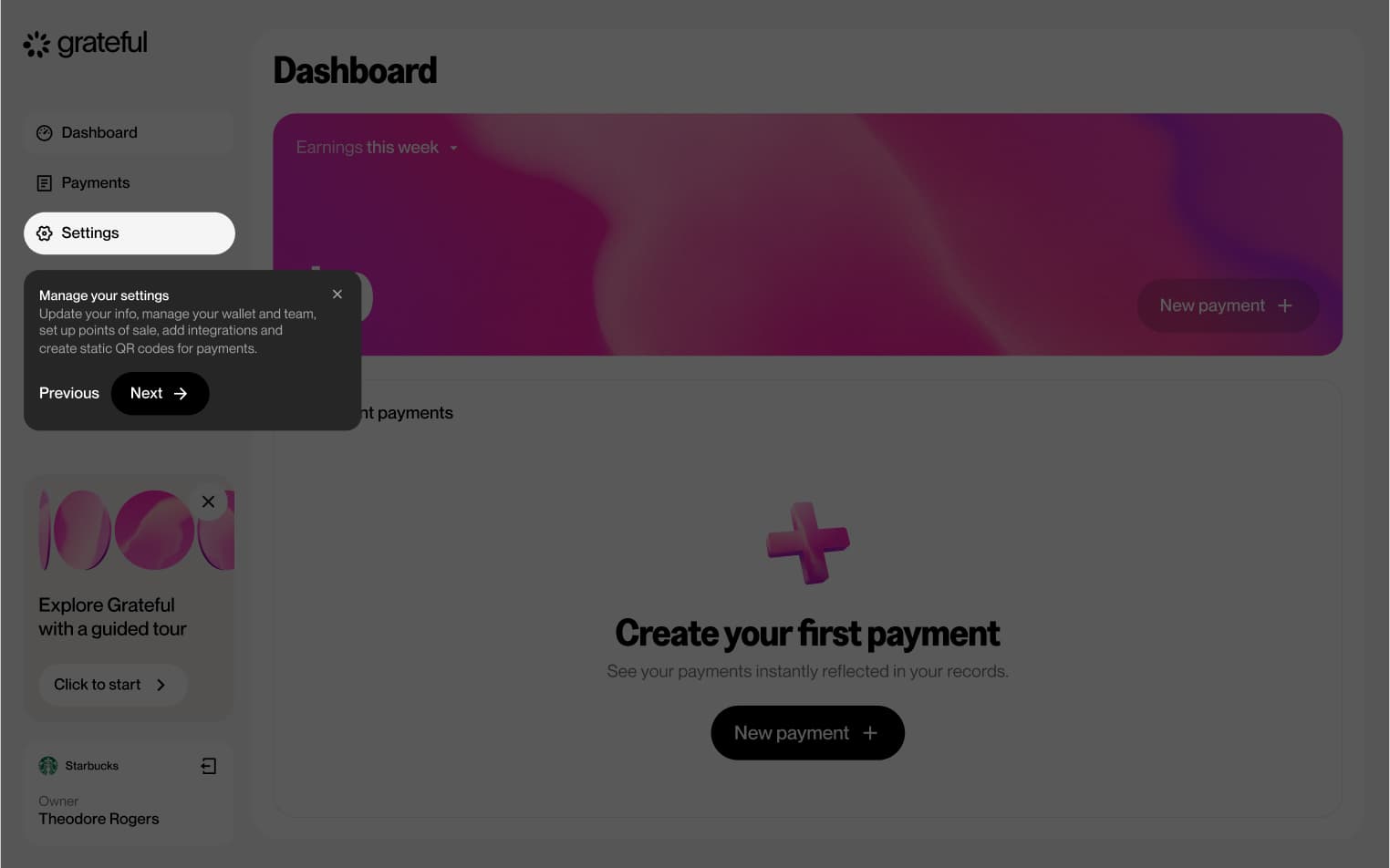 Explore the key workflows available to merchants through the Grateful dashboard. This section documents the core journeys that allow businesses to set up their account, manage payments, and configure their operations, focusing on the happy path for each feature. Each flow is presented step by step to provide a clear view of the dashboard experience, from onboarding to day-to-day payment management.