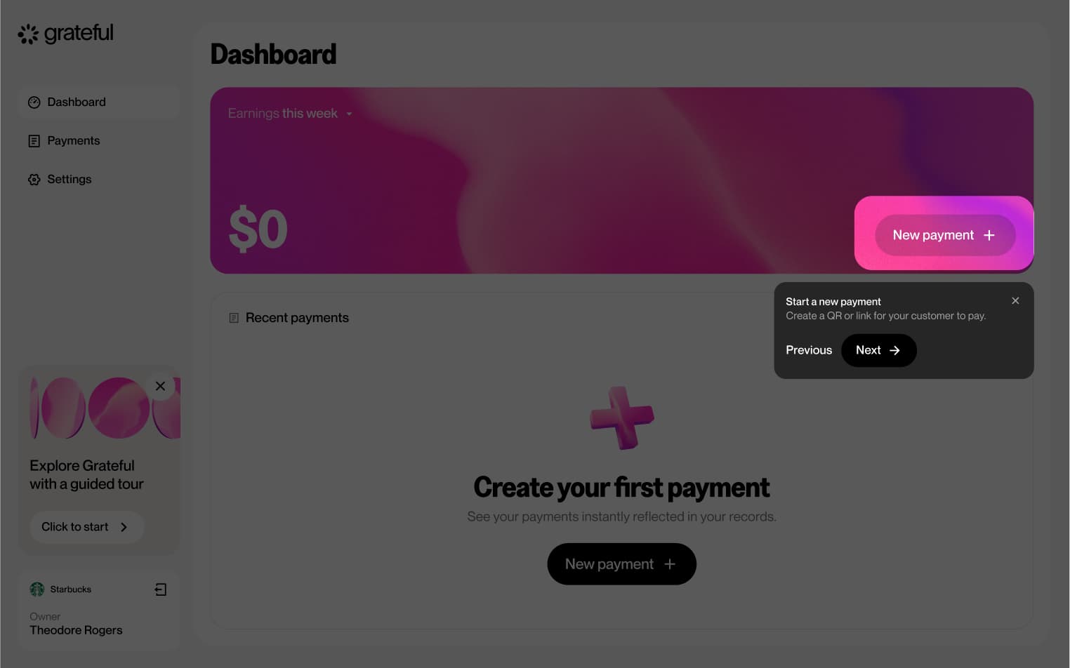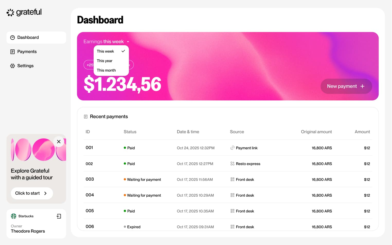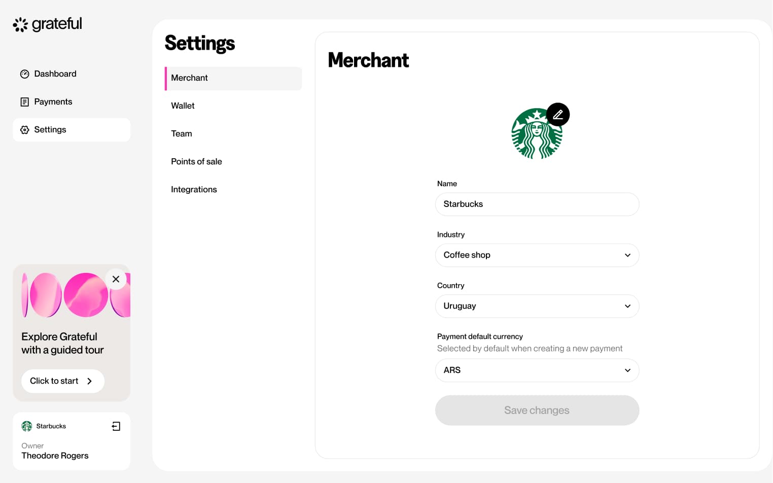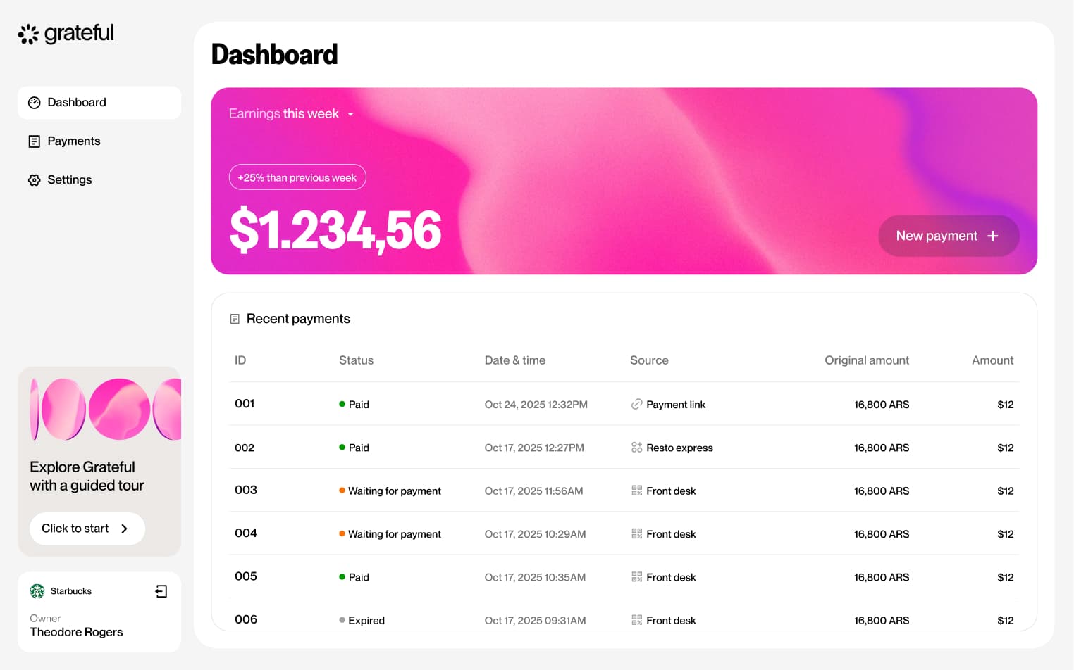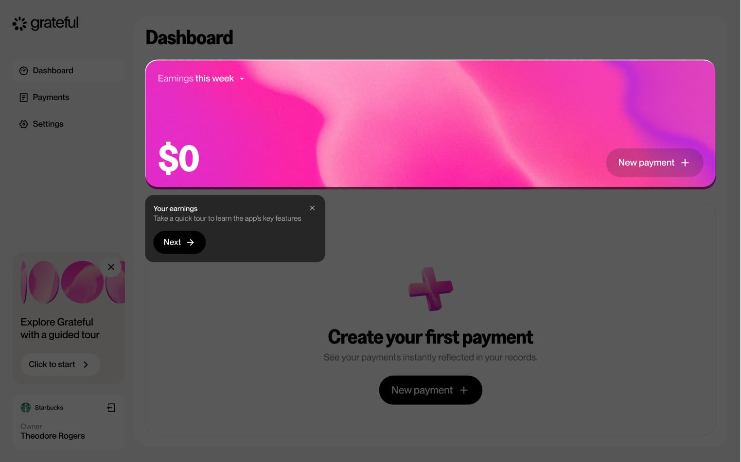 Explore the key workflows available to merchants through the Grateful dashboard. This section documents the core journeys that allow businesses to set up their account, manage payments, and configure their operations, focusing on the happy path for each feature. Each flow is presented step by step to provide a clear view of the dashboard experience, from onboarding to day-to-day payment management.