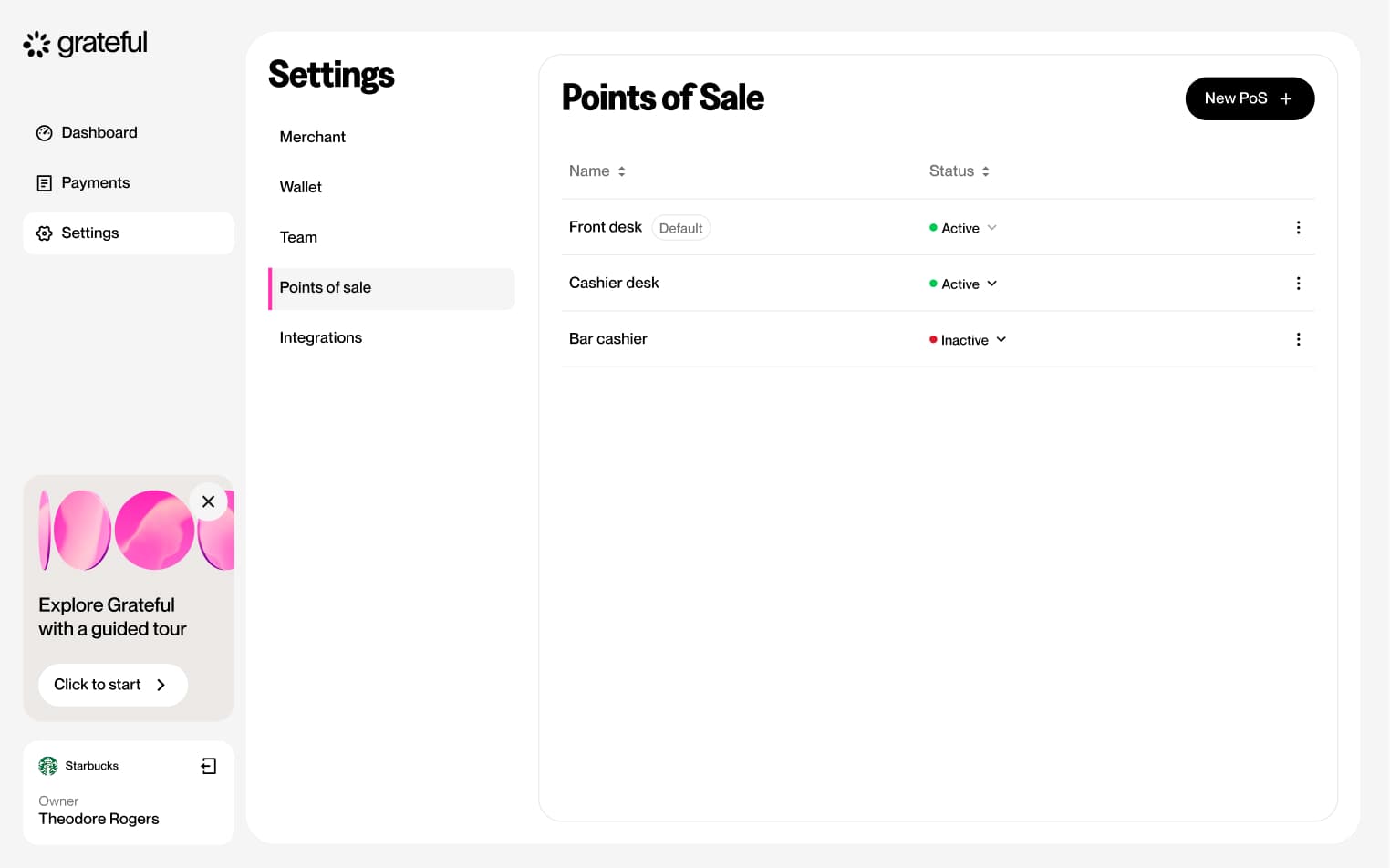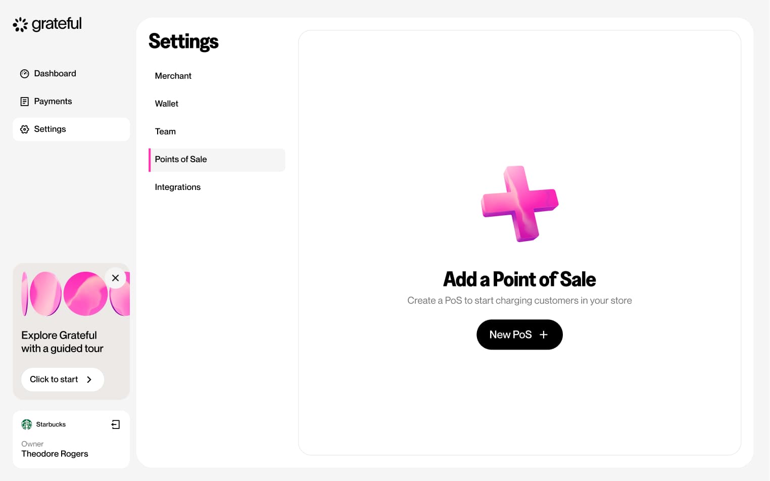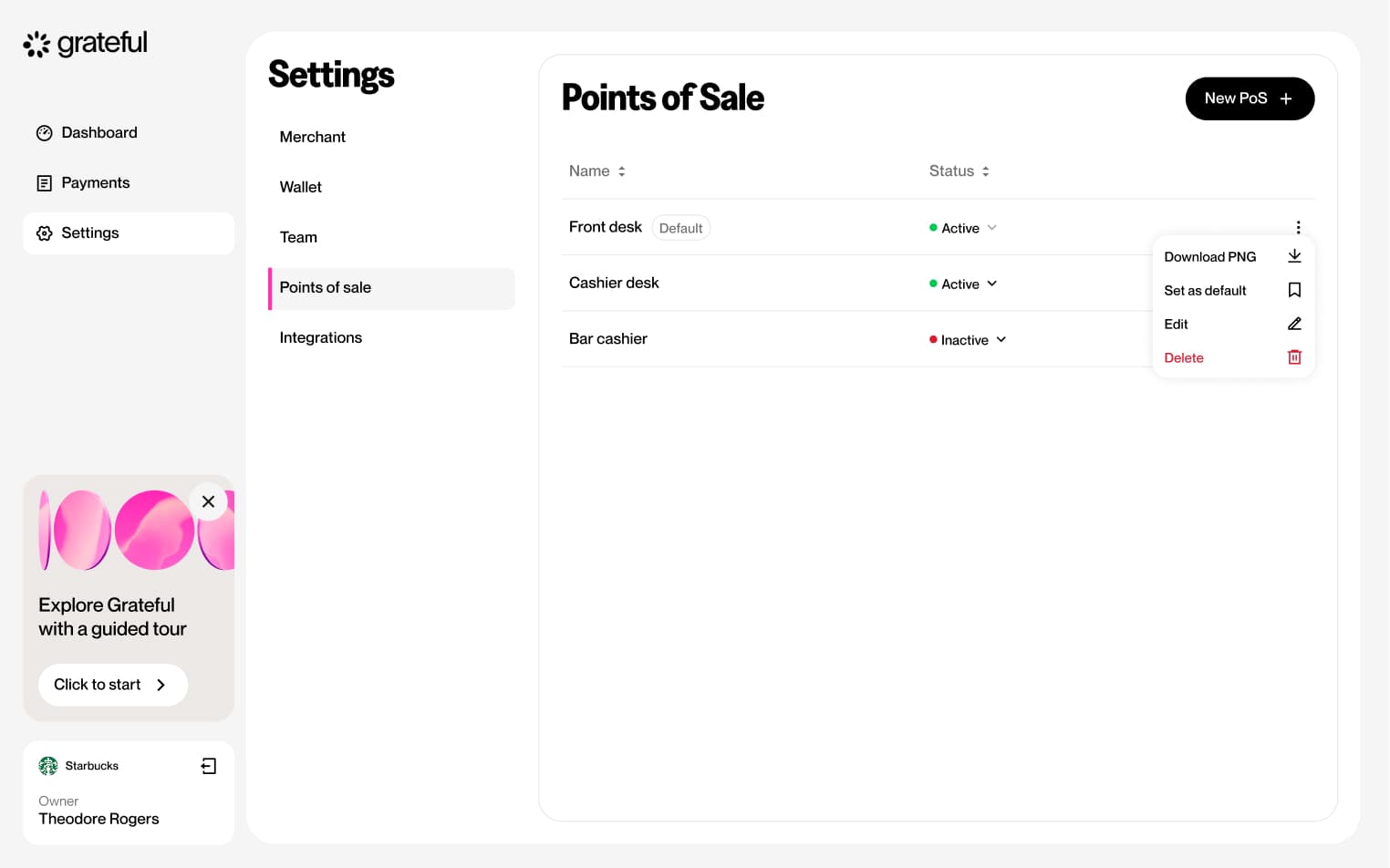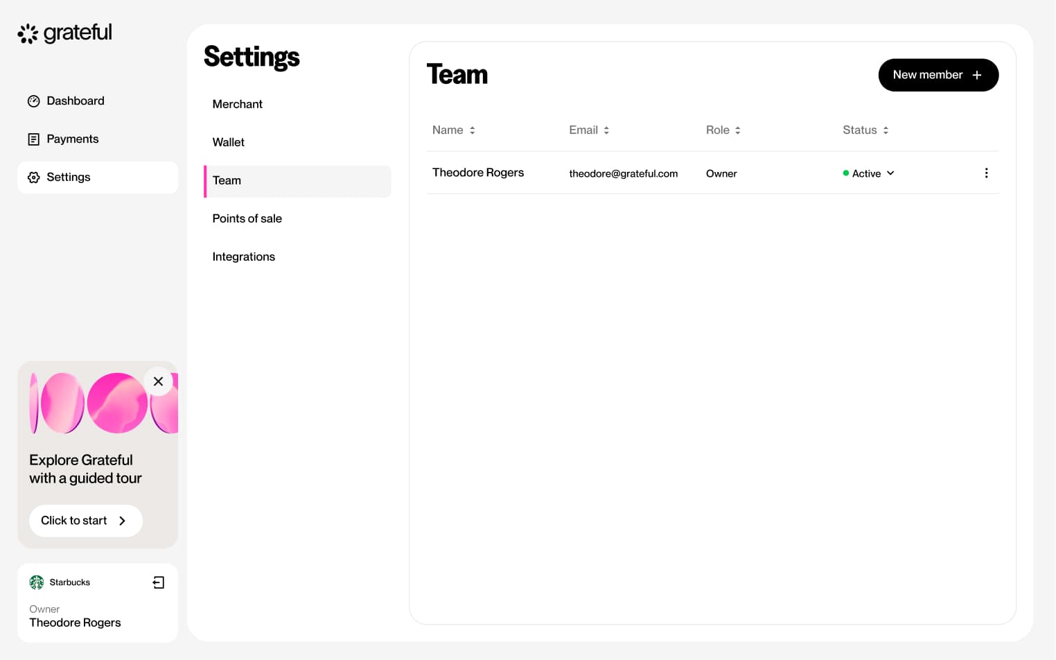 Explore the key workflows available to merchants through the Grateful dashboard. This section documents the core journeys that allow businesses to set up their account, manage payments, and configure their operations, focusing on the happy path for each feature. Each flow is presented step by step to provide a clear view of the dashboard experience, from onboarding to day-to-day payment management.