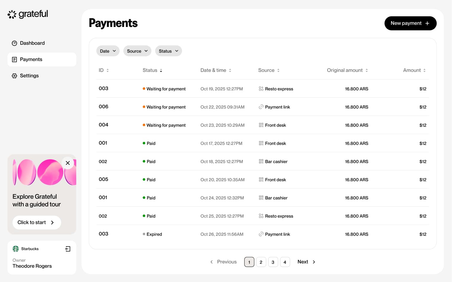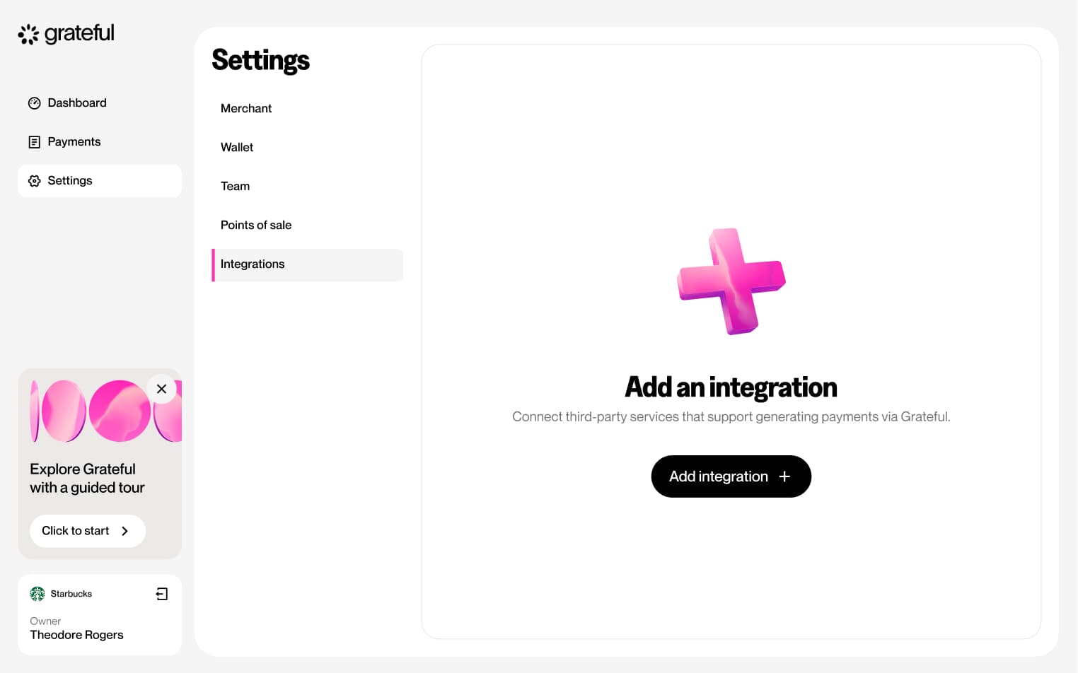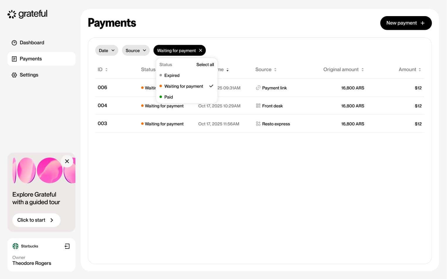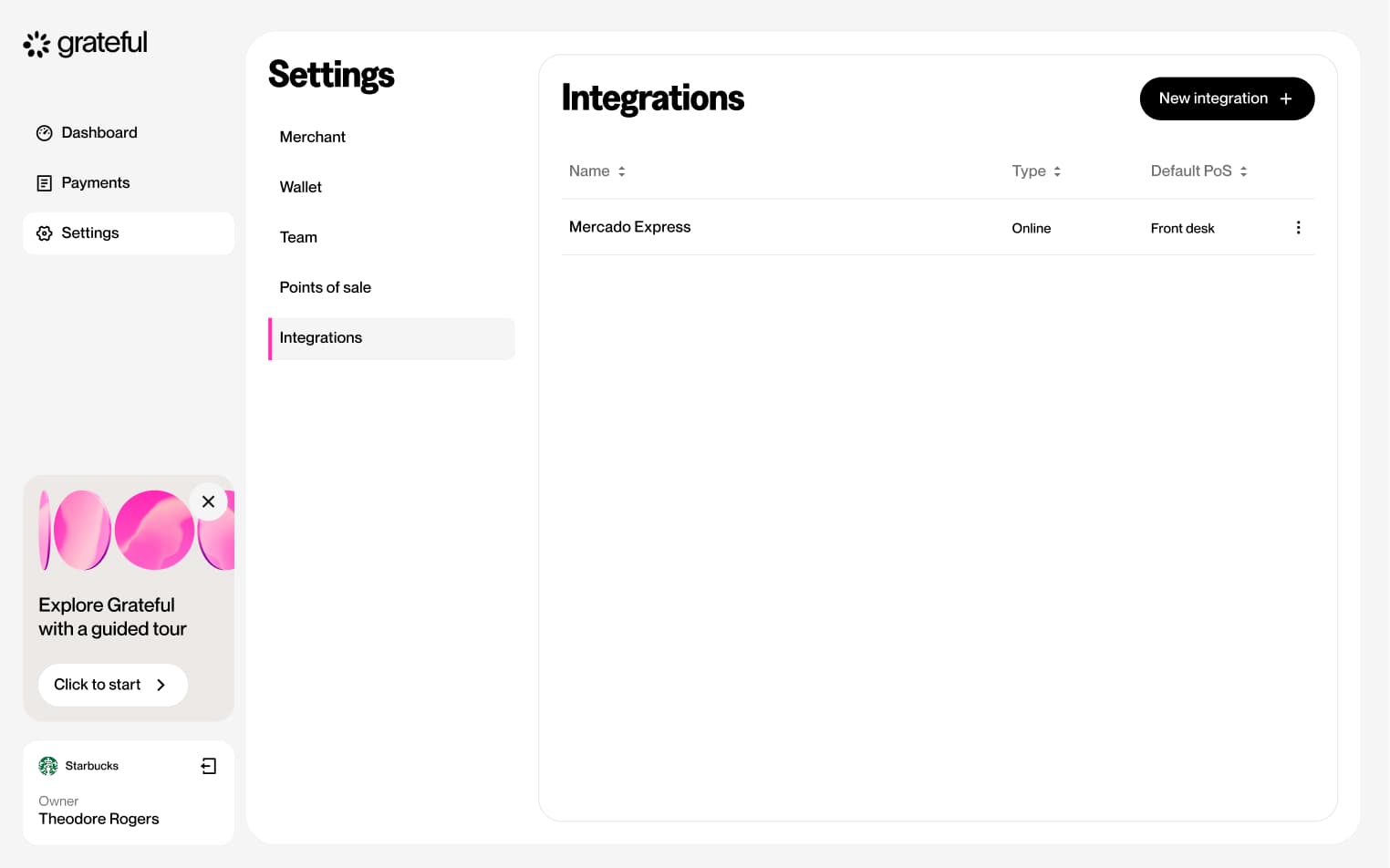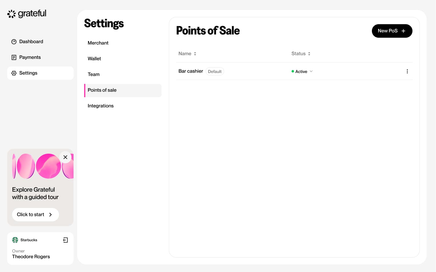 Explore the key workflows available to merchants through the Grateful dashboard. This section documents the core journeys that allow businesses to set up their account, manage payments, and configure their operations, focusing on the happy path for each feature. Each flow is presented step by step to provide a clear view of the dashboard experience, from onboarding to day-to-day payment management.