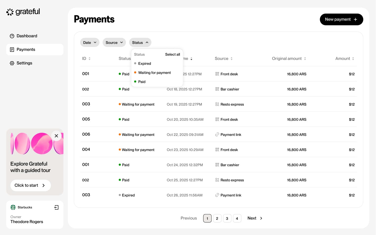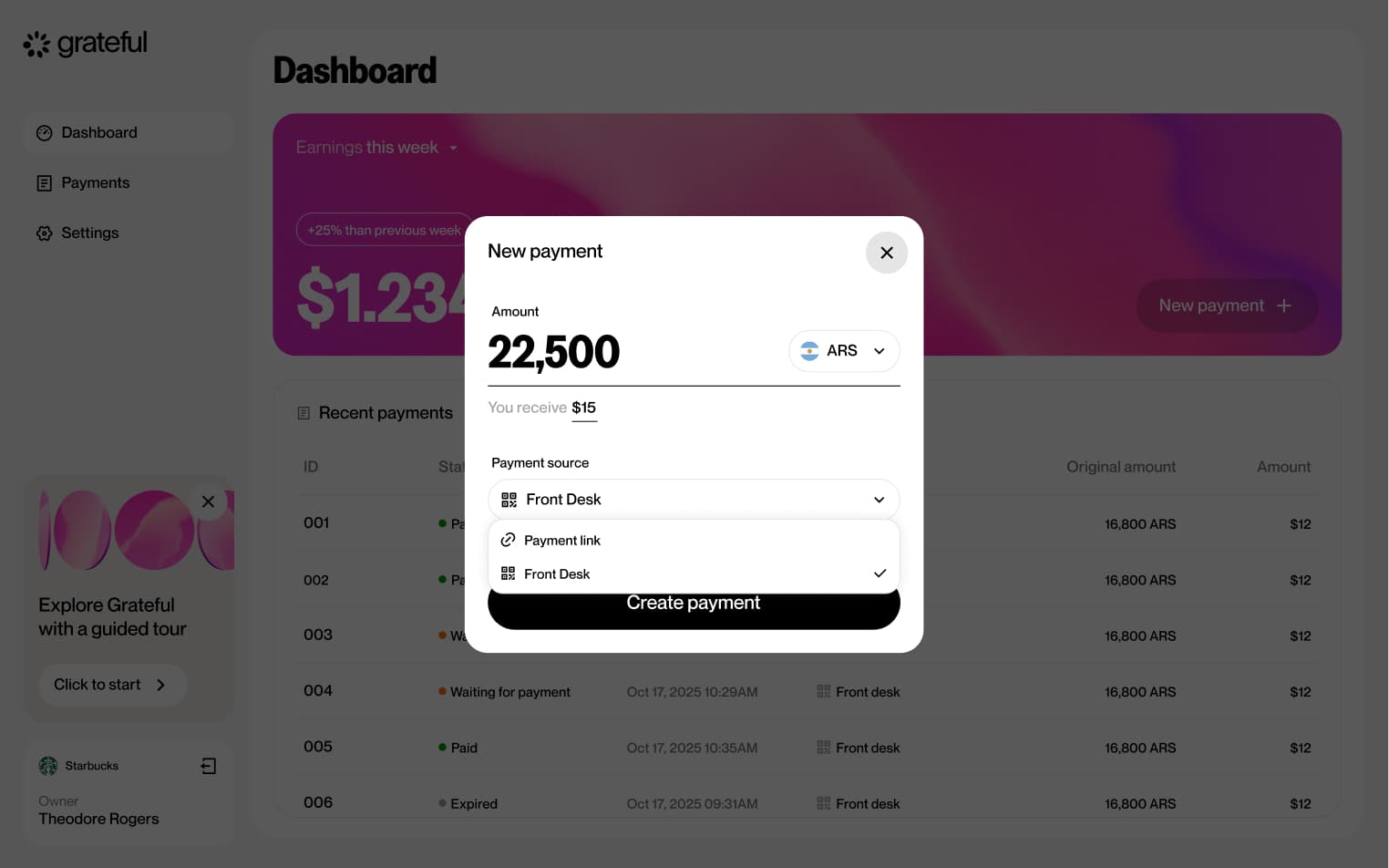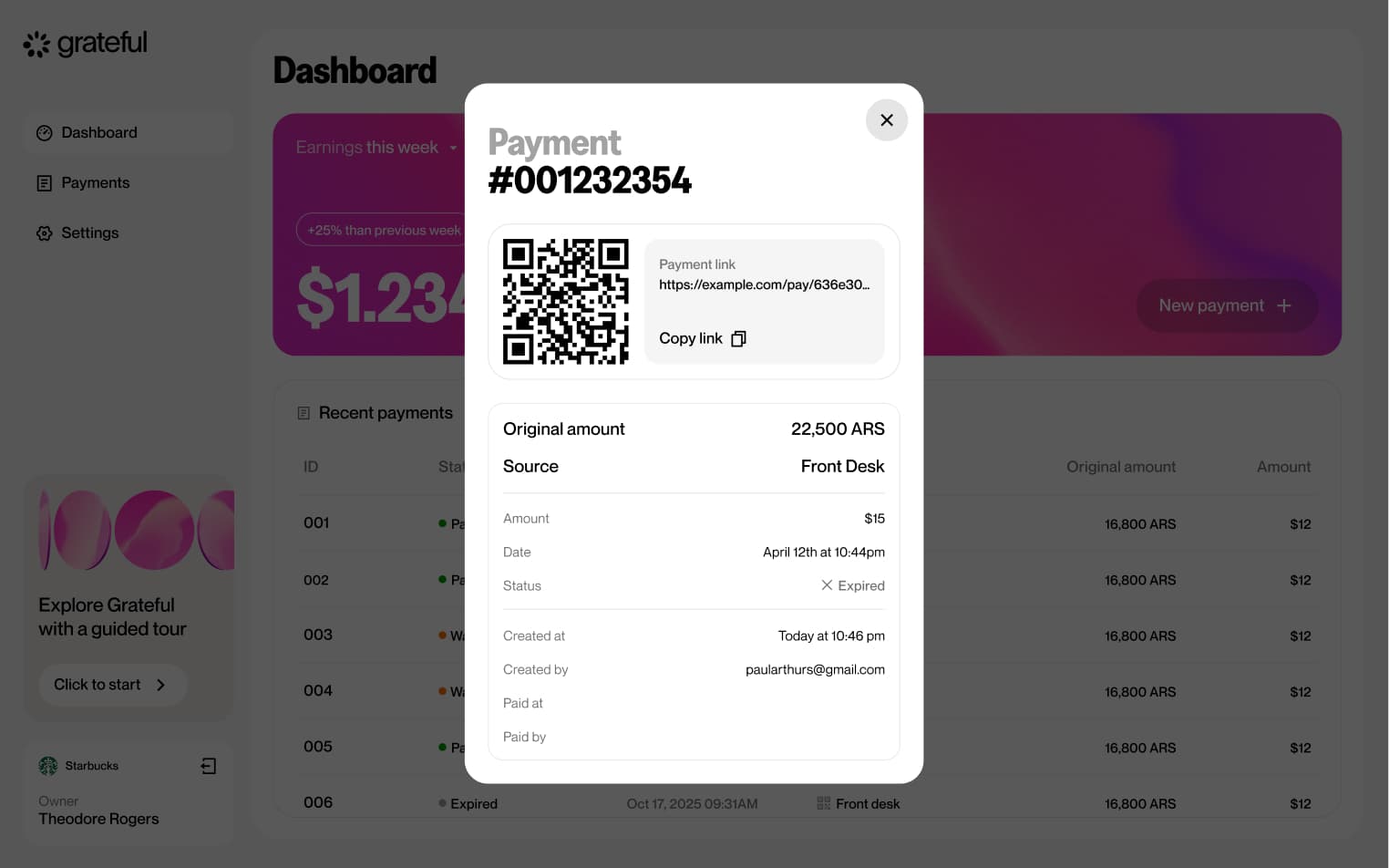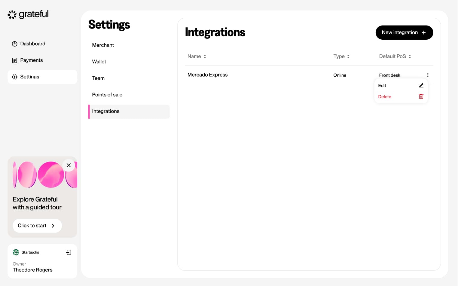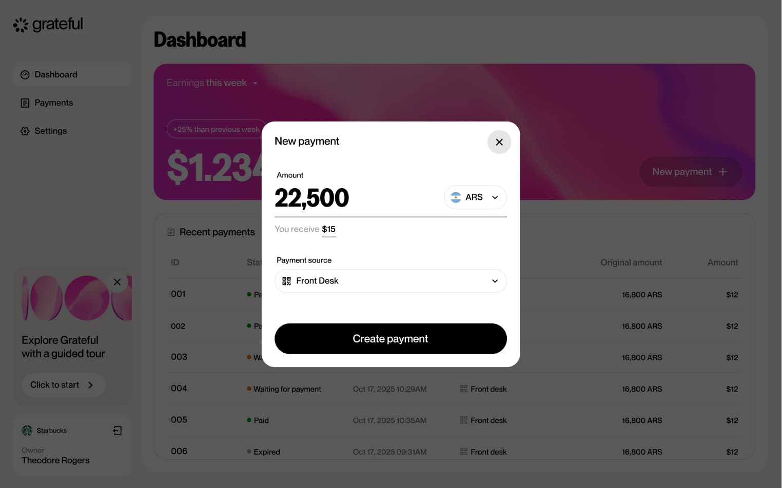 Explore the key workflows available to merchants through the Grateful dashboard. This section documents the core journeys that allow businesses to set up their account, manage payments, and configure their operations, focusing on the happy path for each feature. Each flow is presented step by step to provide a clear view of the dashboard experience, from onboarding to day-to-day payment management.
