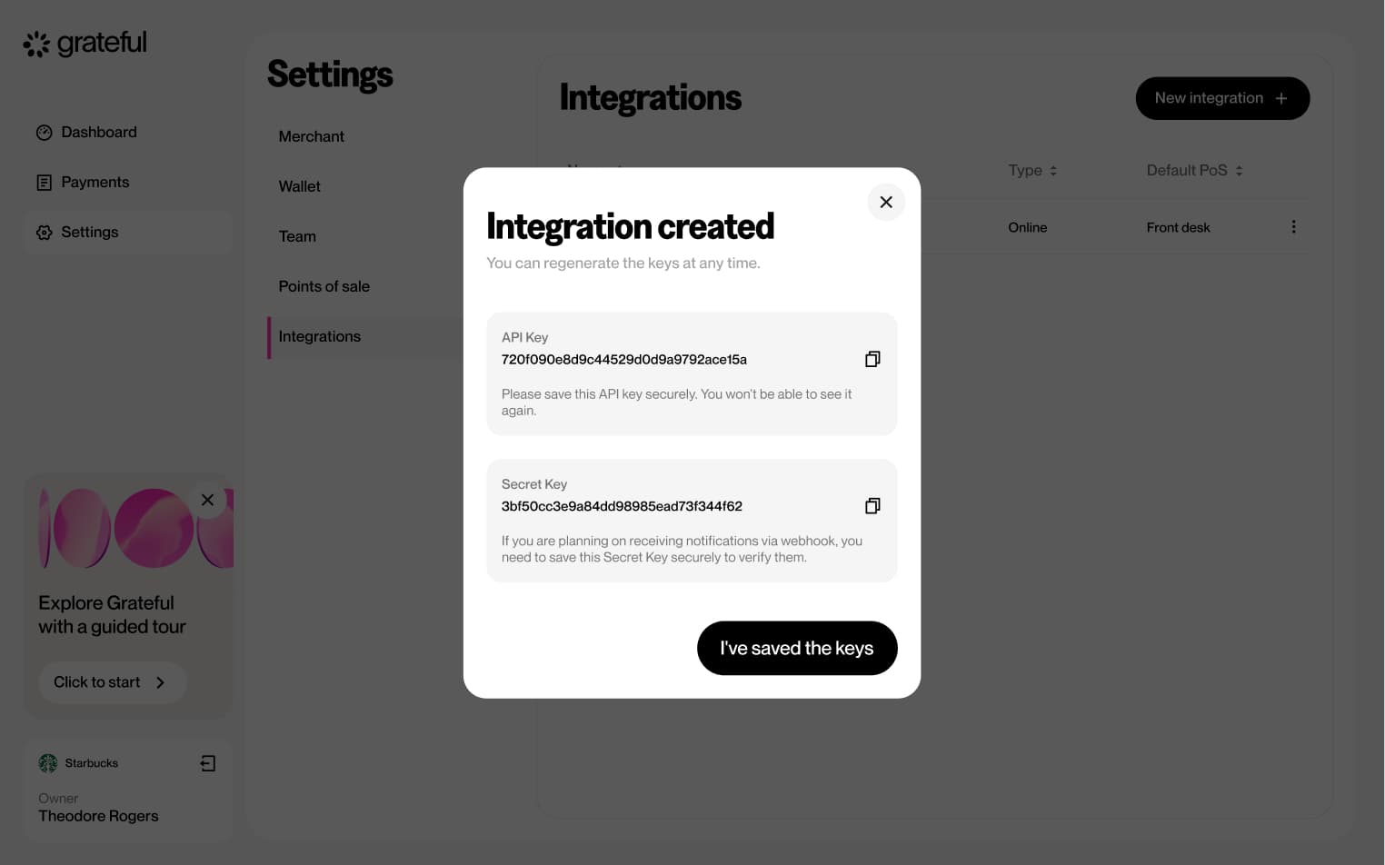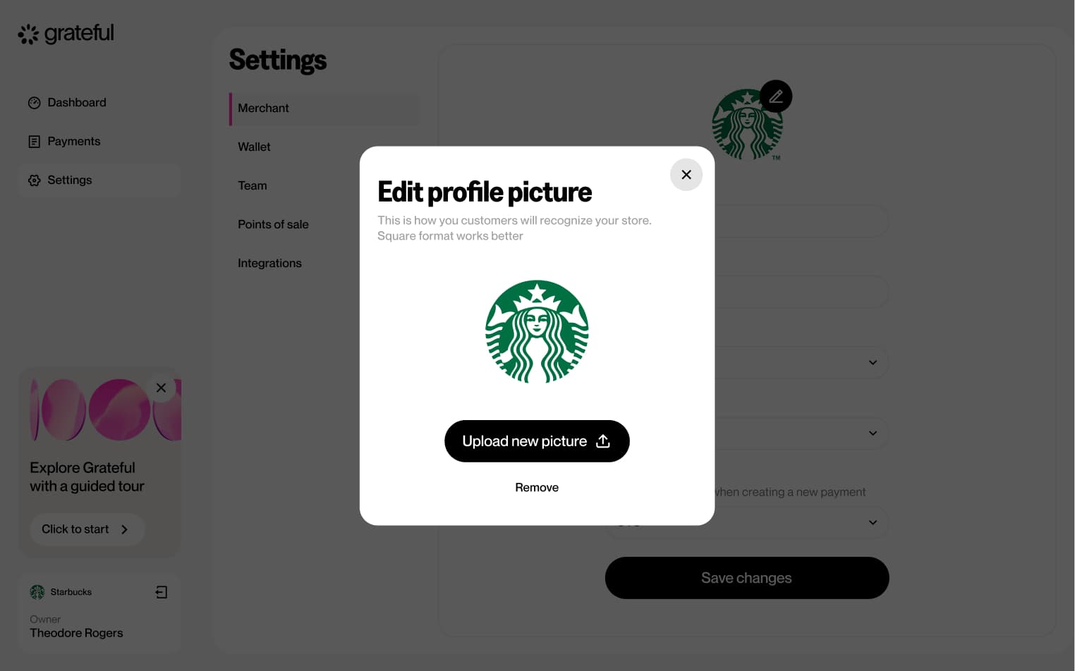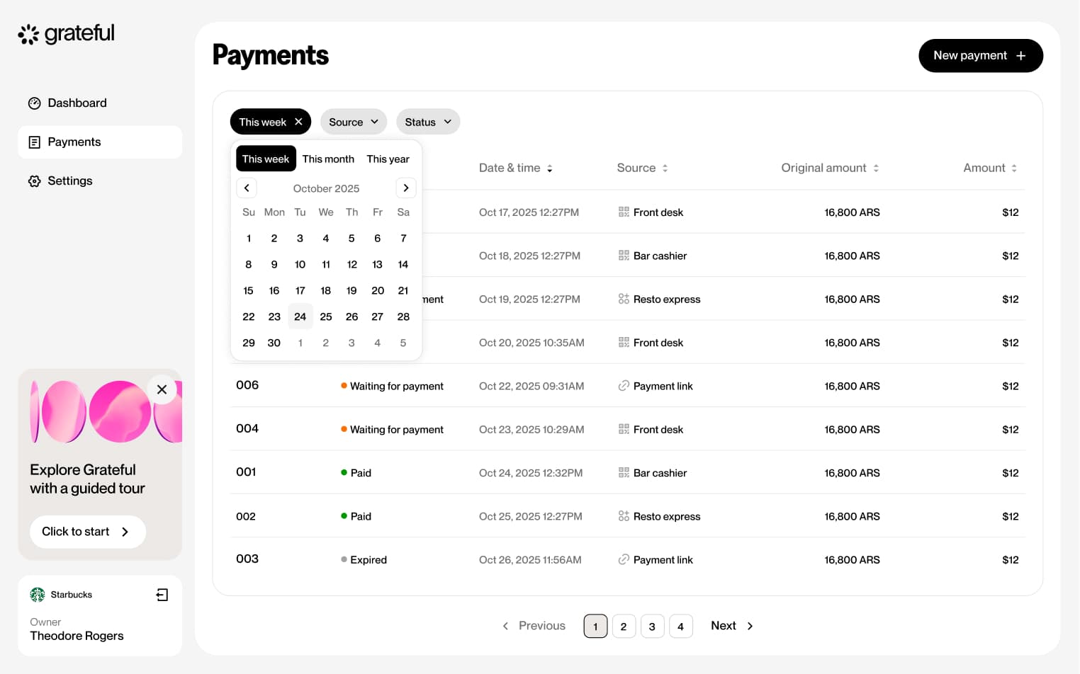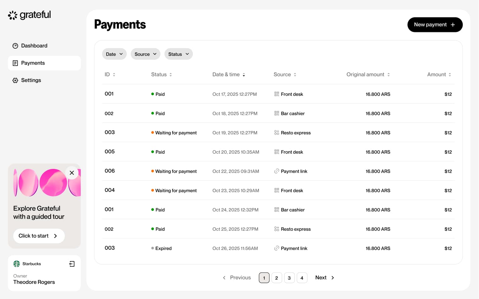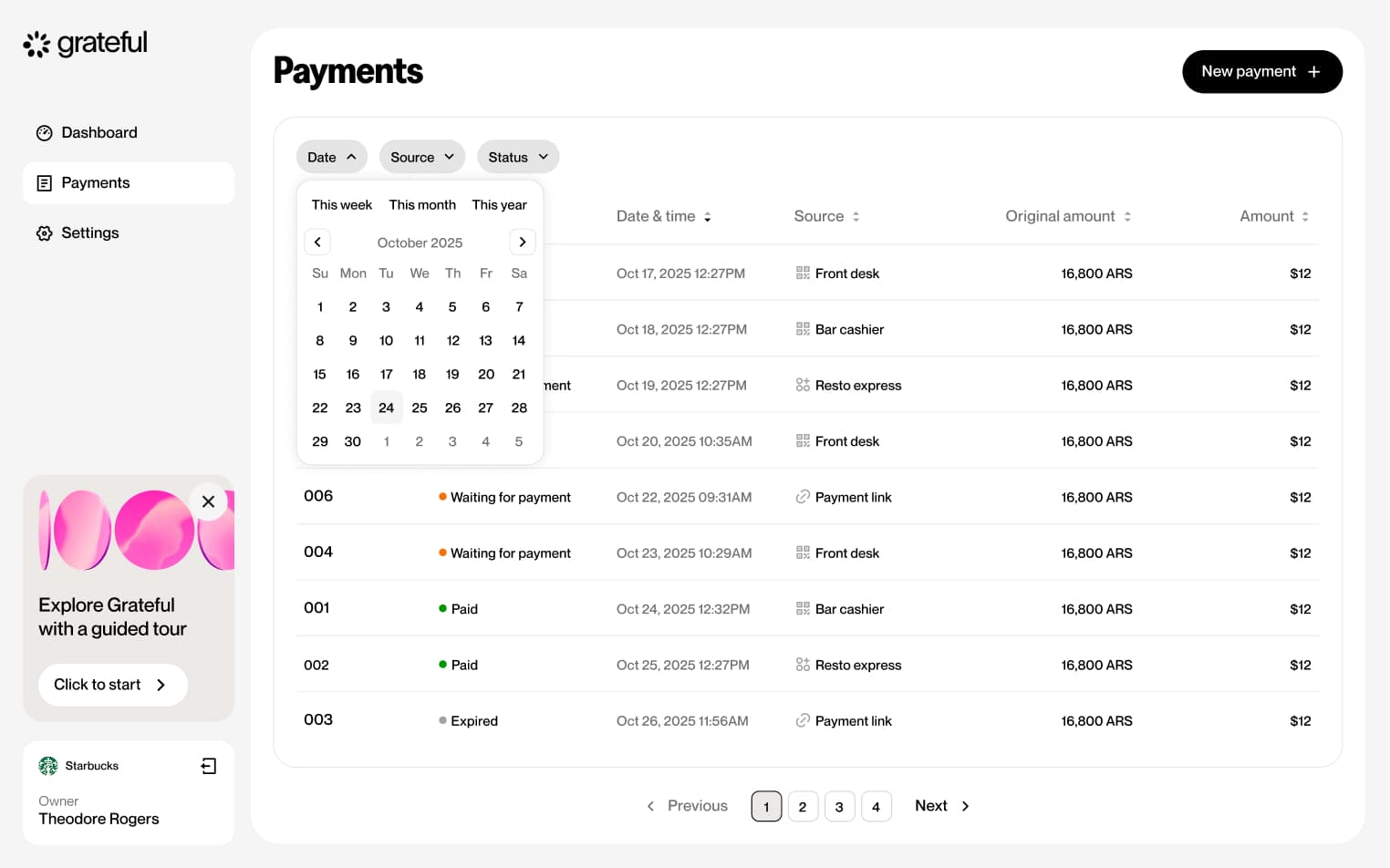 Explore the key workflows available to merchants through the Grateful dashboard. This section documents the core journeys that allow businesses to set up their account, manage payments, and configure their operations, focusing on the happy path for each feature. Each flow is presented step by step to provide a clear view of the dashboard experience, from onboarding to day-to-day payment management.