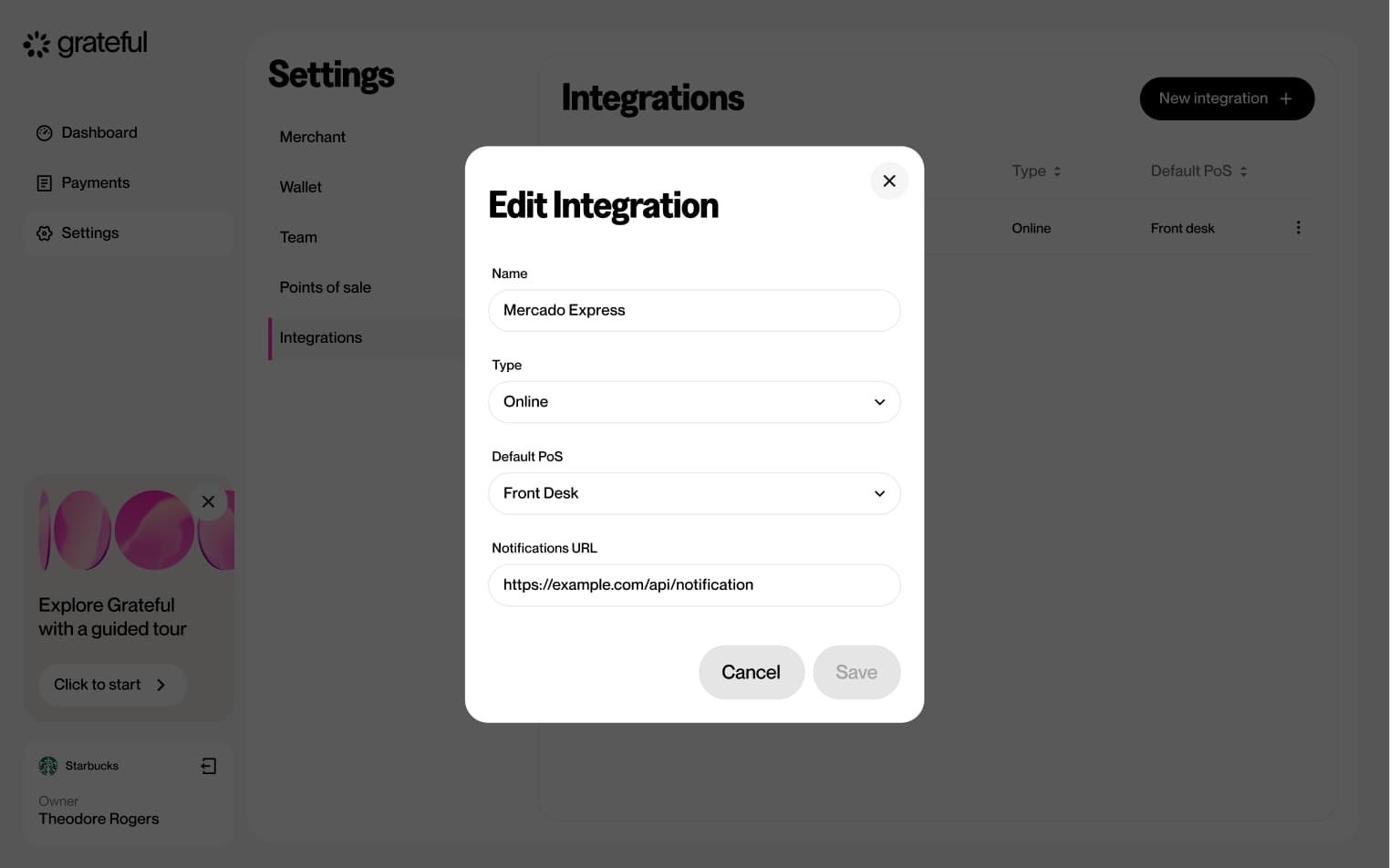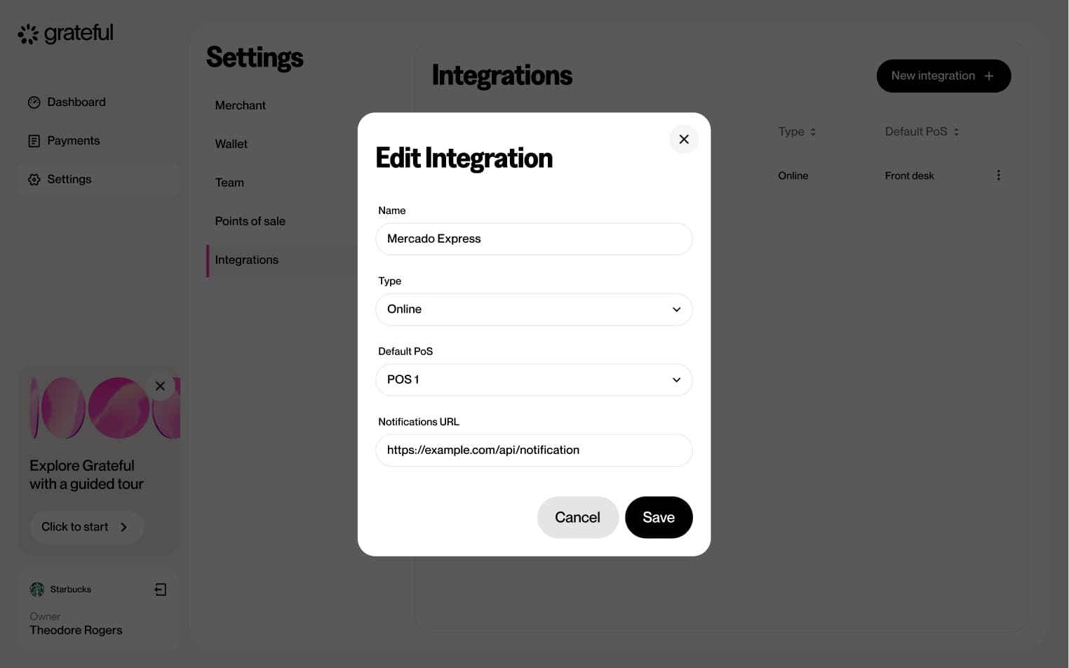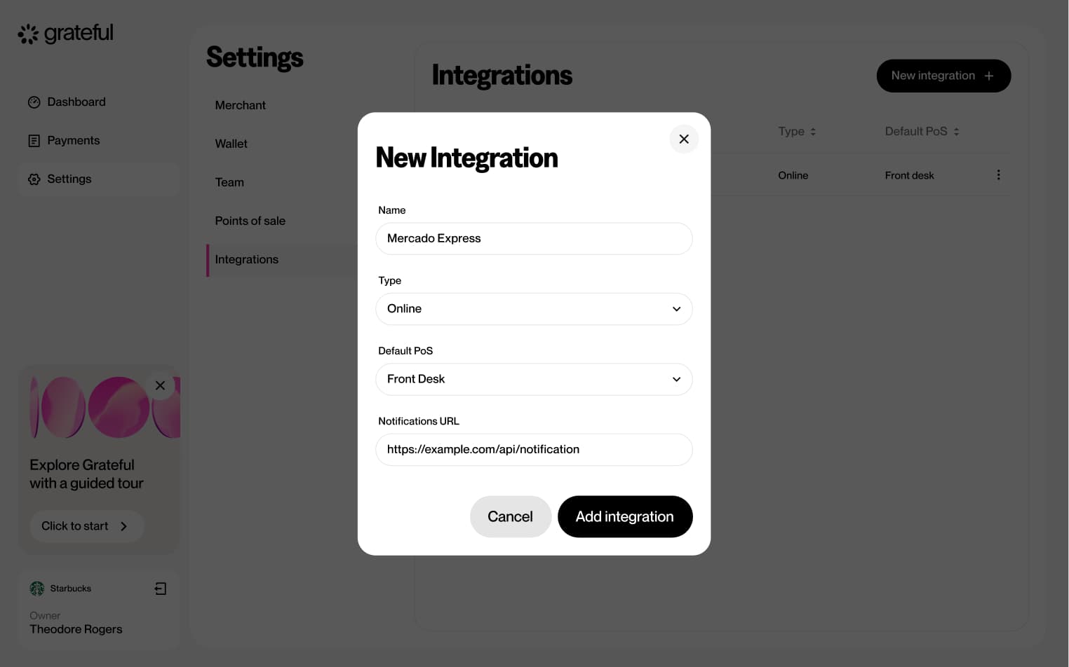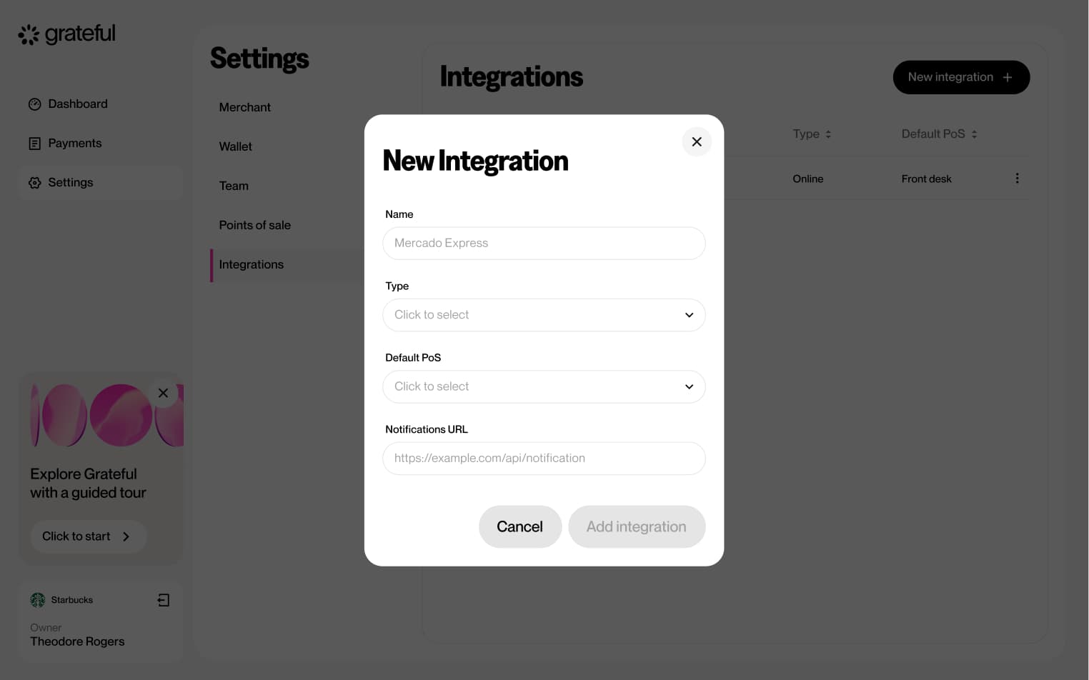 6 screensThe Create Integration flow allows merchants to set up a new integration directly from Settings. Users navigate to the Integrations section, create a new entry, and configure it by providing a name, type, default PoS, and notifications URL before confirming.