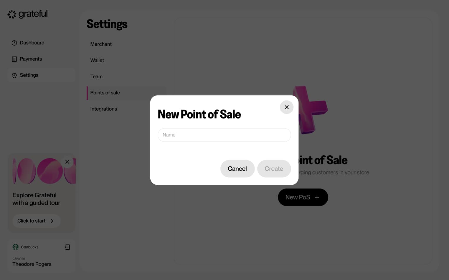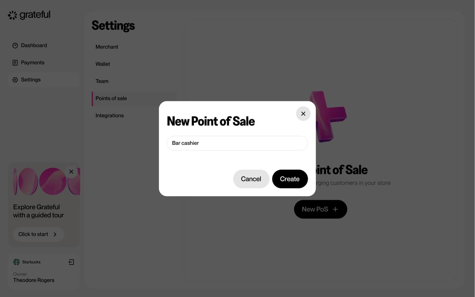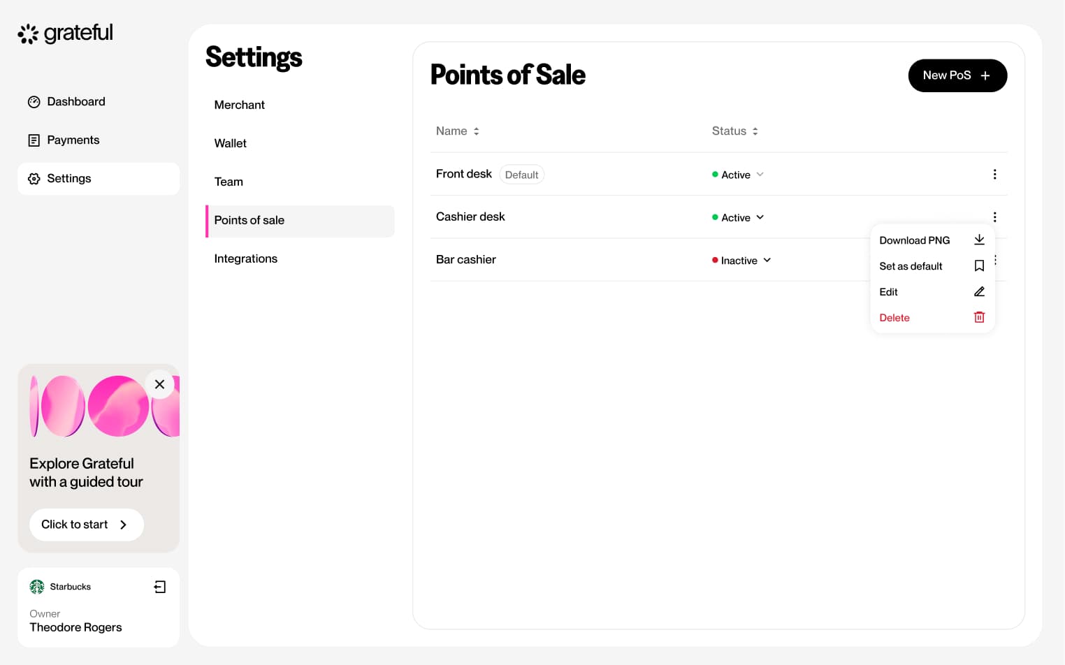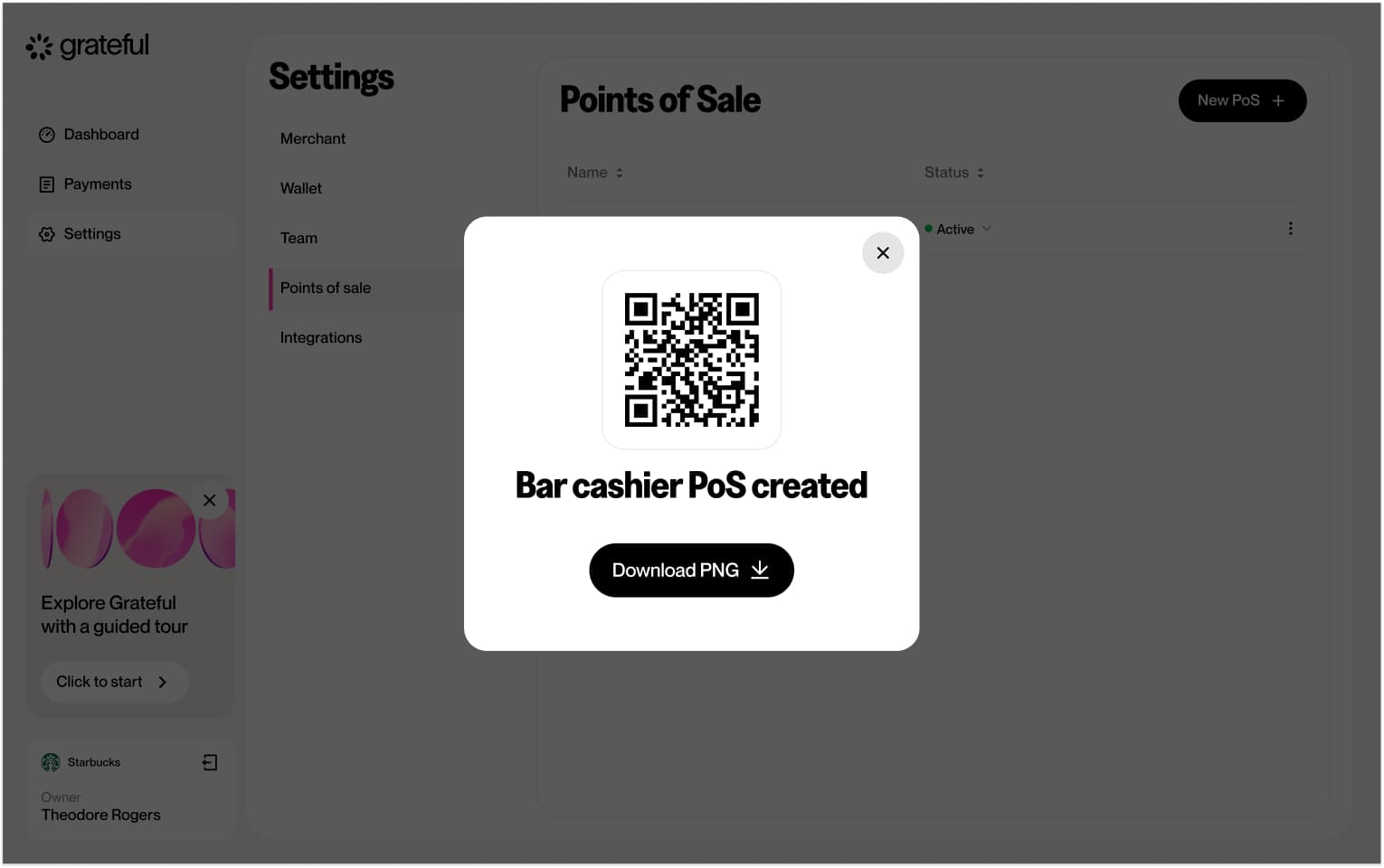 6 screensThe Create PoS flow allows merchants to set up a new point-of-sale directly from Settings. Users navigate to the PoS section, create a new entry, assign it a name, and a unique QR code is generated and displayed.