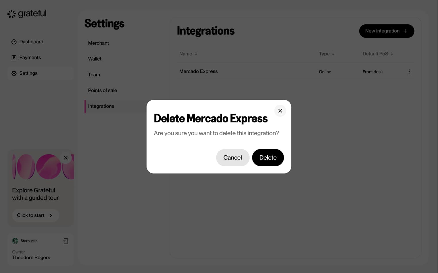 5 screensThe Delete Integration flow allows merchants to remove an existing integration directly from the Settings screen.