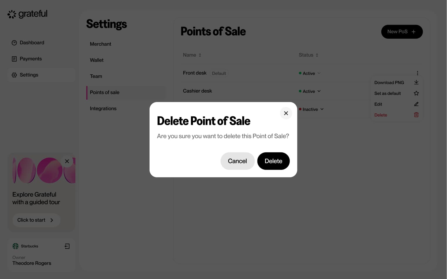5 screensThe Delete PoS flow allows merchants to remove an existing point-of-sale directly from the Settings screen.