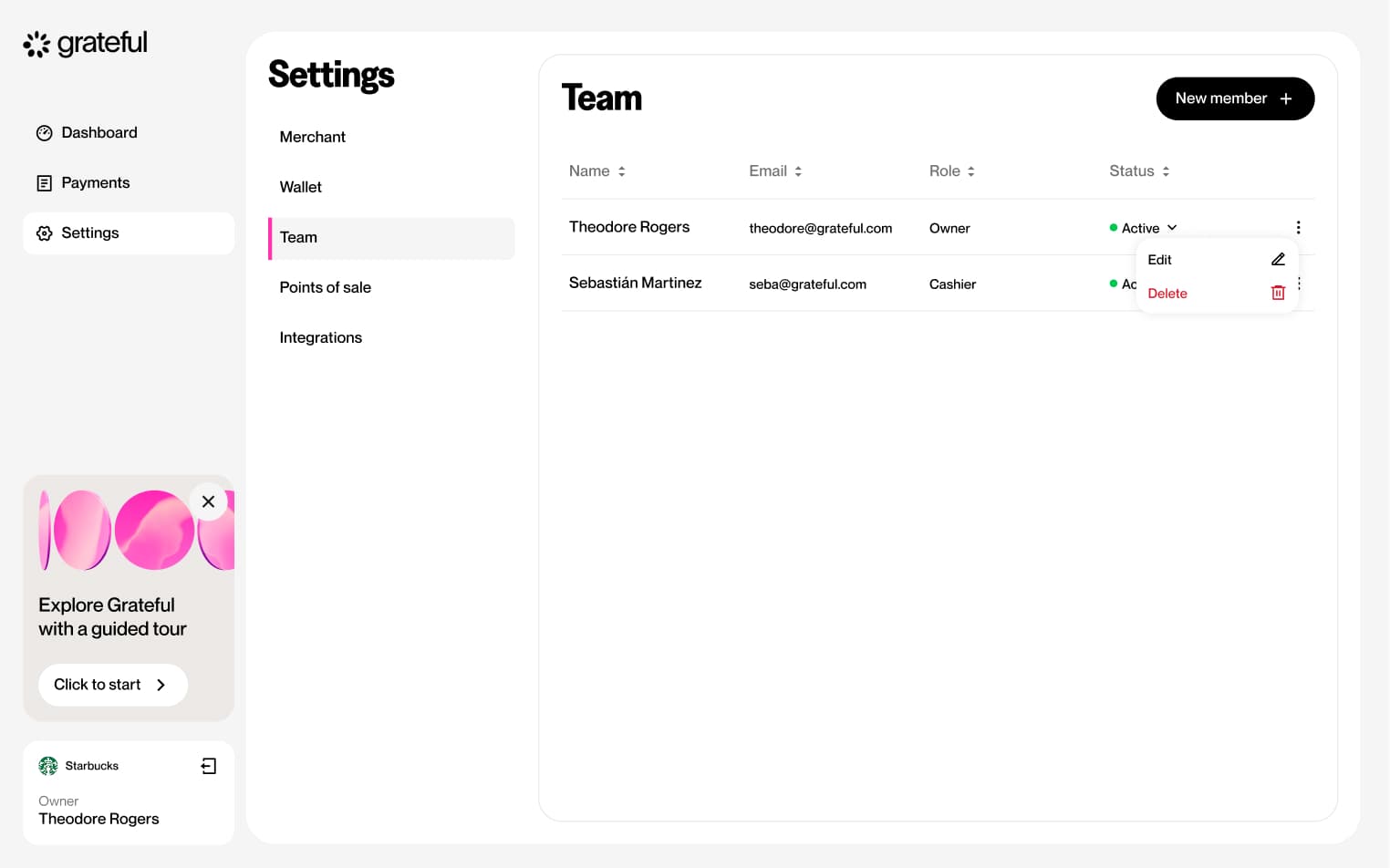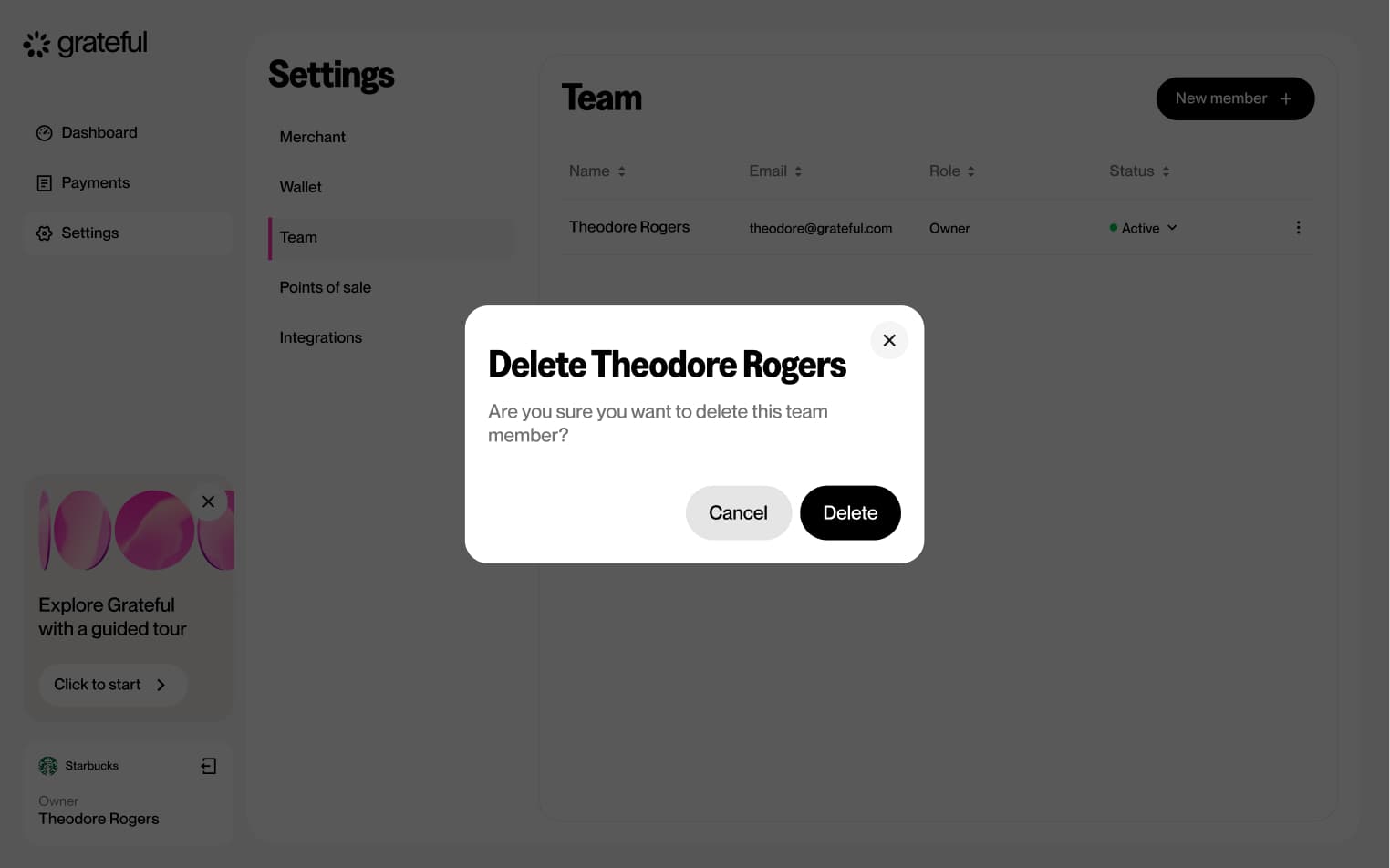 5 screensThe Delete Team Member flow allows merchants to remove a team member from their dashboard directly from the Settings screen.