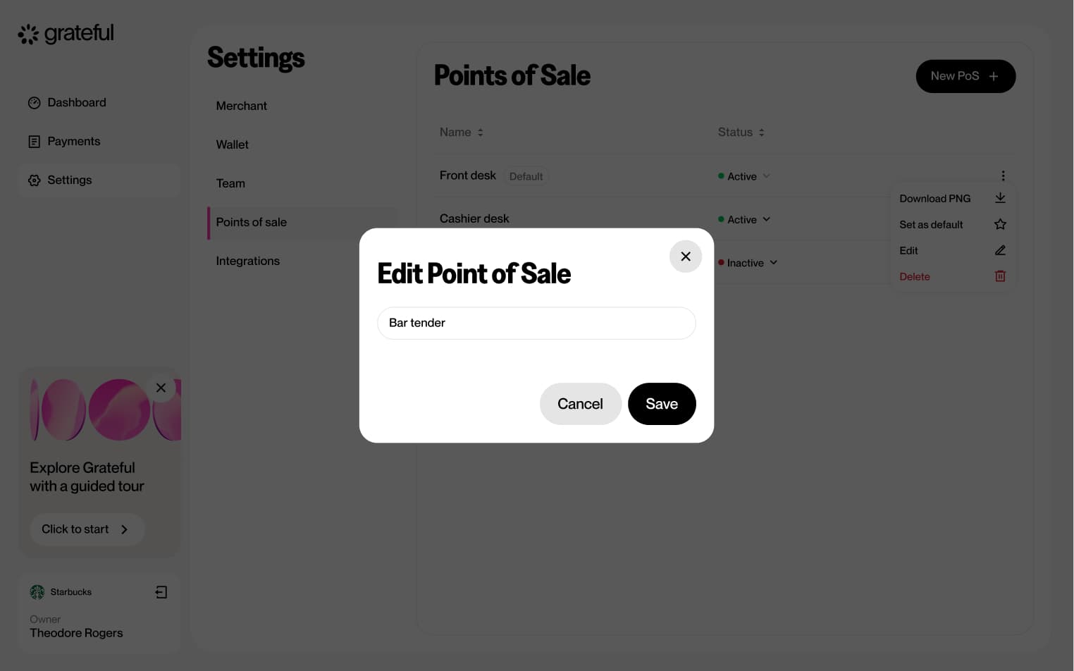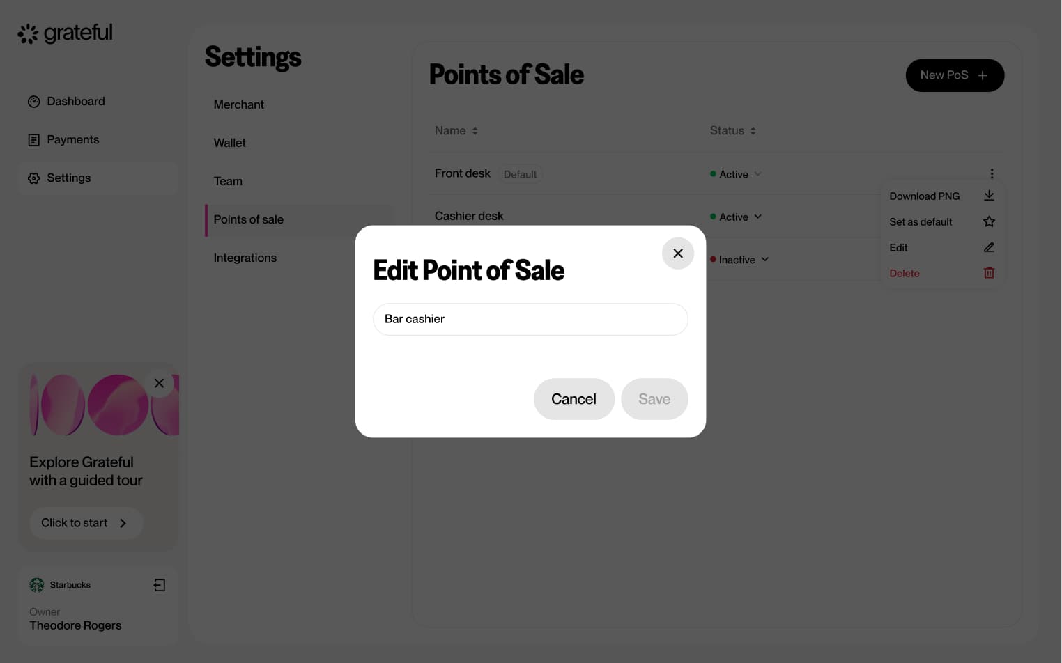 6 screensThe Edit PoS Name flow allows merchants to rename an existing point-of-sale directly from the Settings screen.