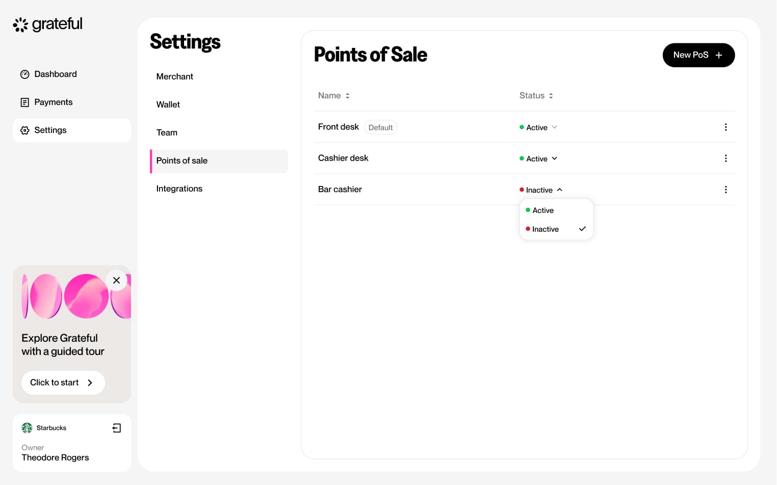 4 screensThe Edit PoS Status flow allows merchants to toggle each point-of-sale between active and inactive directly from the Settings screen.