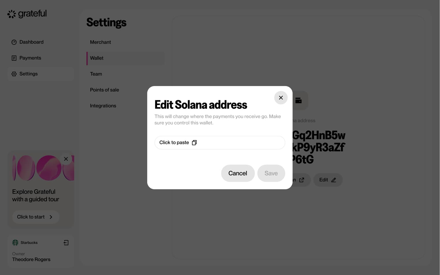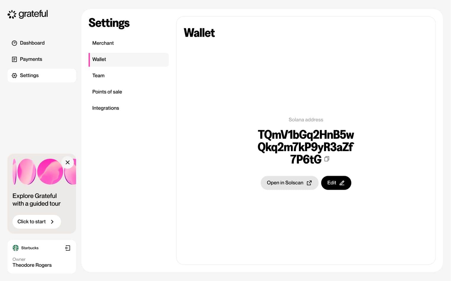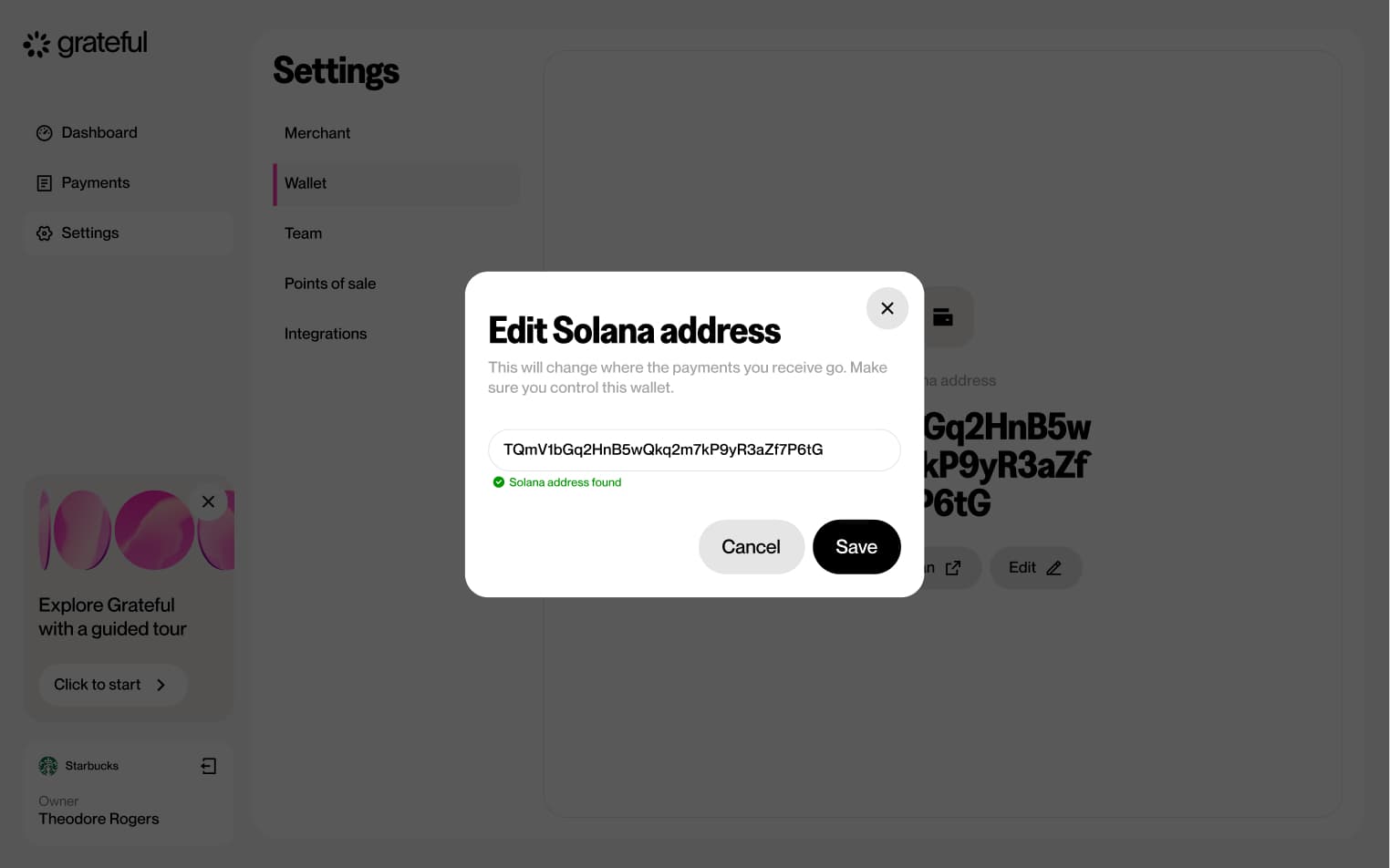 5 screensThe Edit Wallet Address flow allows merchants to update their associated wallet address directly from the Settings screen.