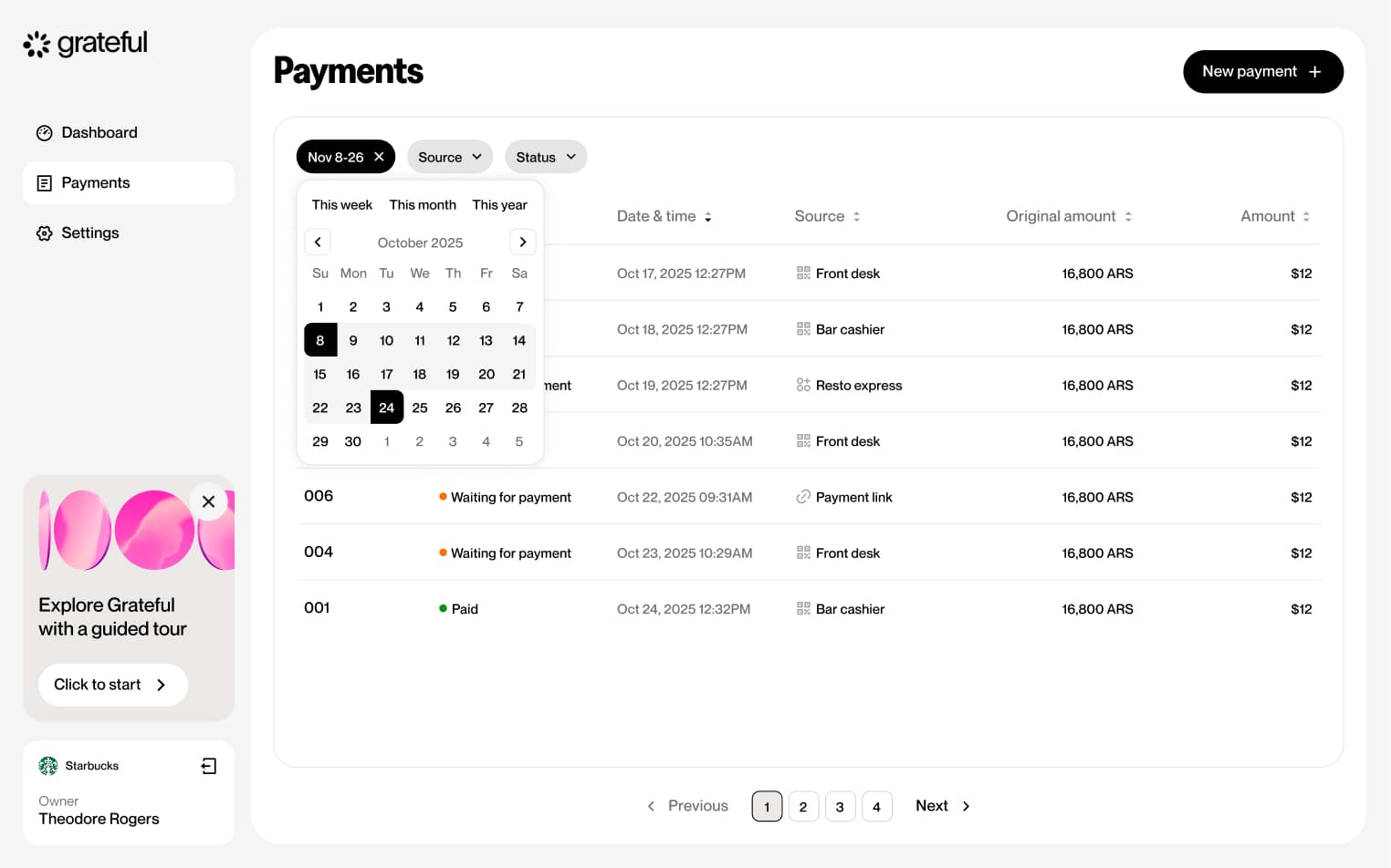 4 screensThe Filter by Date flow allows merchants to narrow down their payment list by date range directly from the Payments screen.