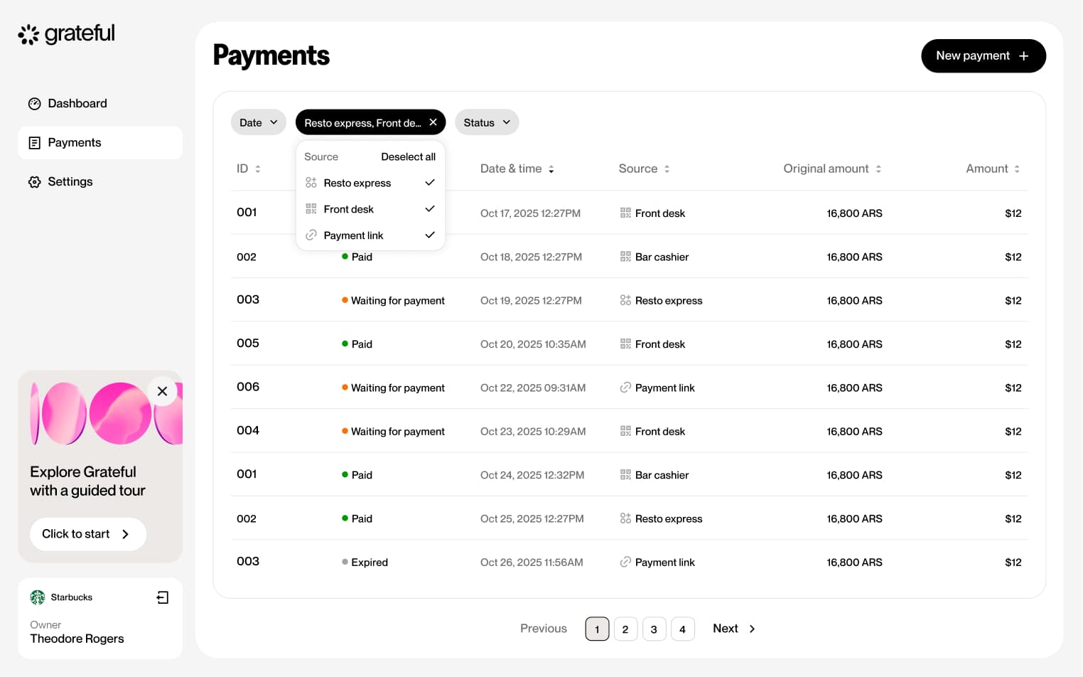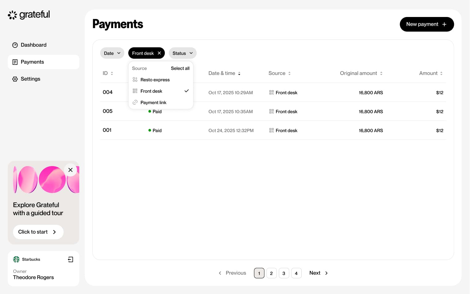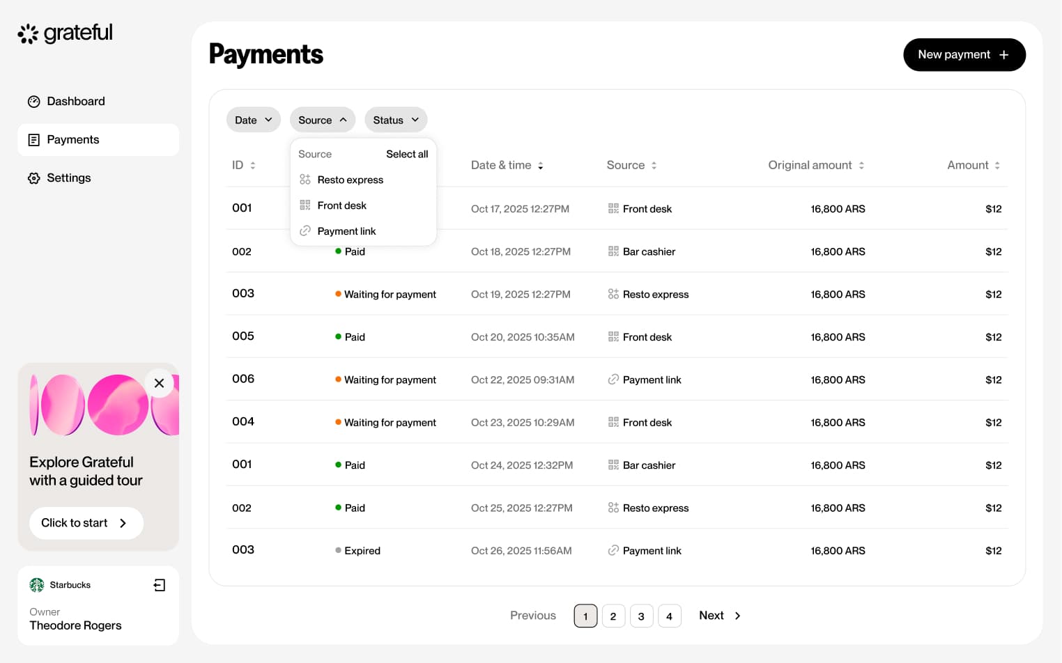4 screensThe Filter by Source flow allows merchants to narrow down their payment list by payment source directly from the Payments screen.