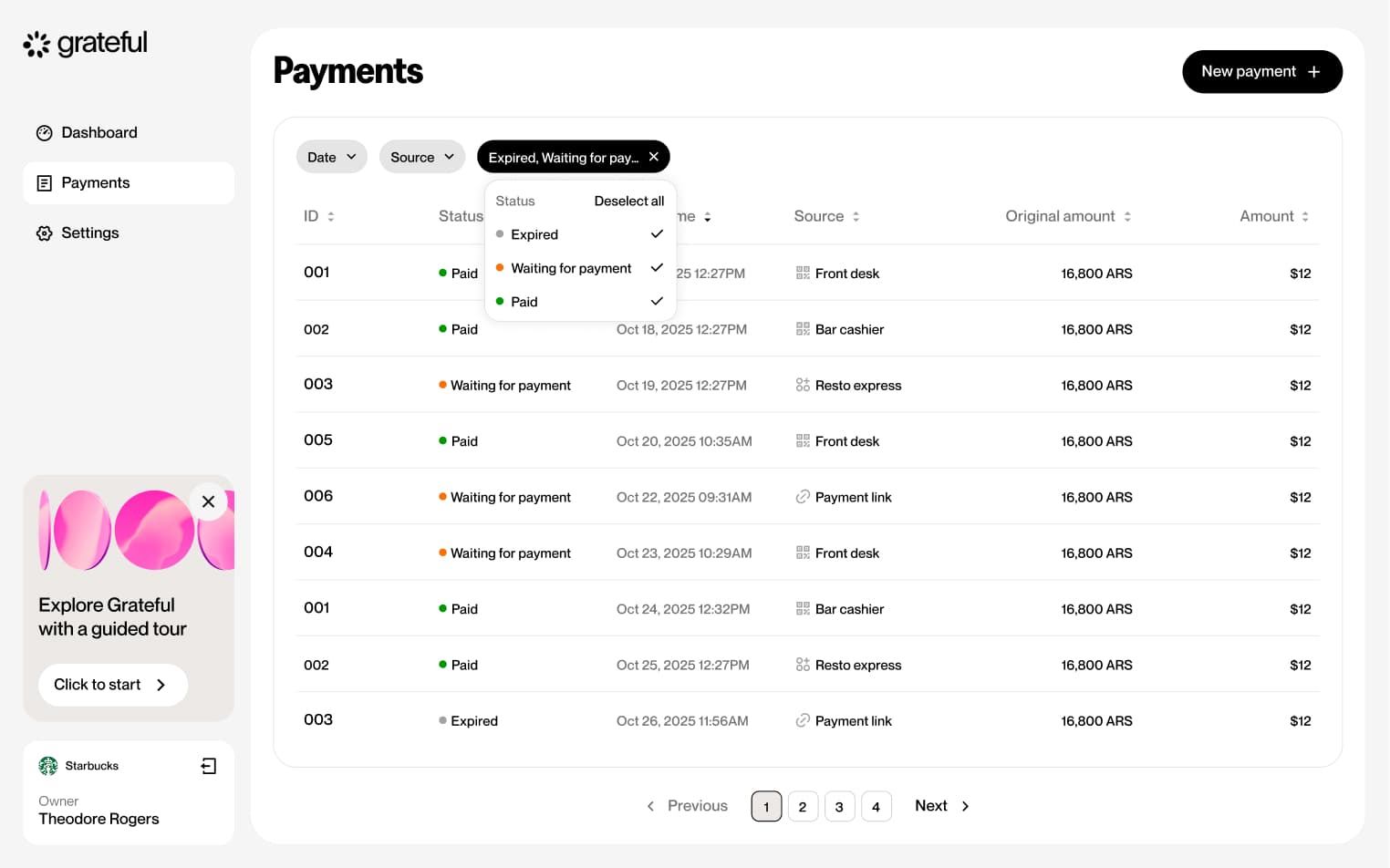 4 screensThe Filter by Status flow allows merchants to narrow down their payment list by status directly from the Payments screen.