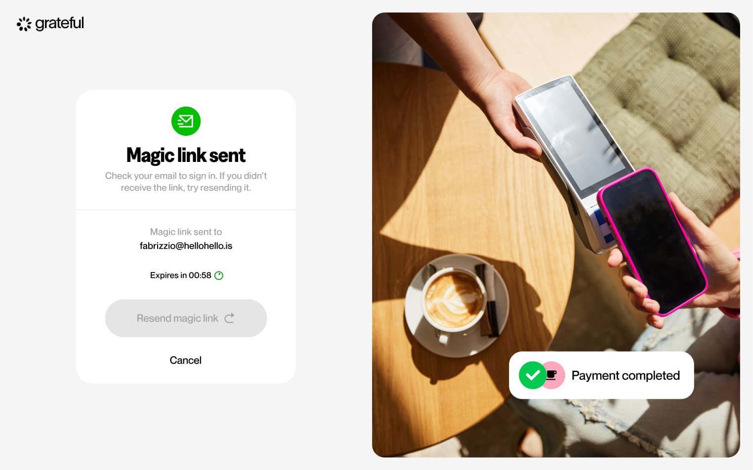 4 screensThe Magic Link Login flow allows merchants to access their dashboard without a password. Users enter their email address, receive a magic link in their inbox, and are taken directly into their account upon clicking it.