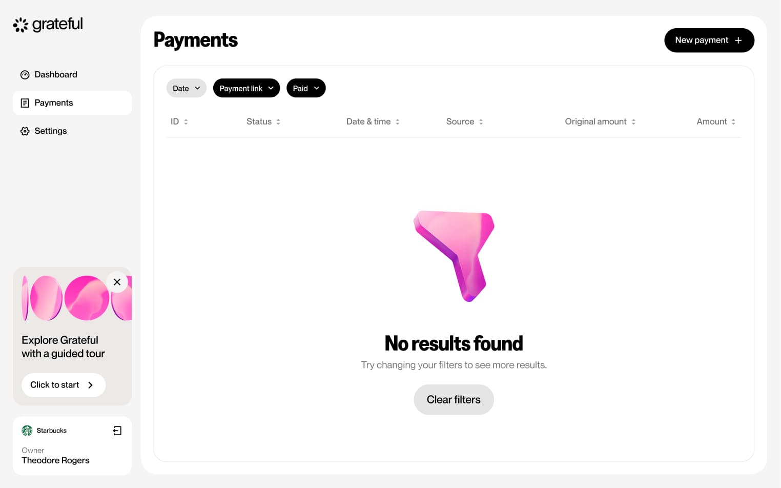 1 screenThe Filter No Results state shows how the Payments screen looks when the applied filters return no matching transactions.